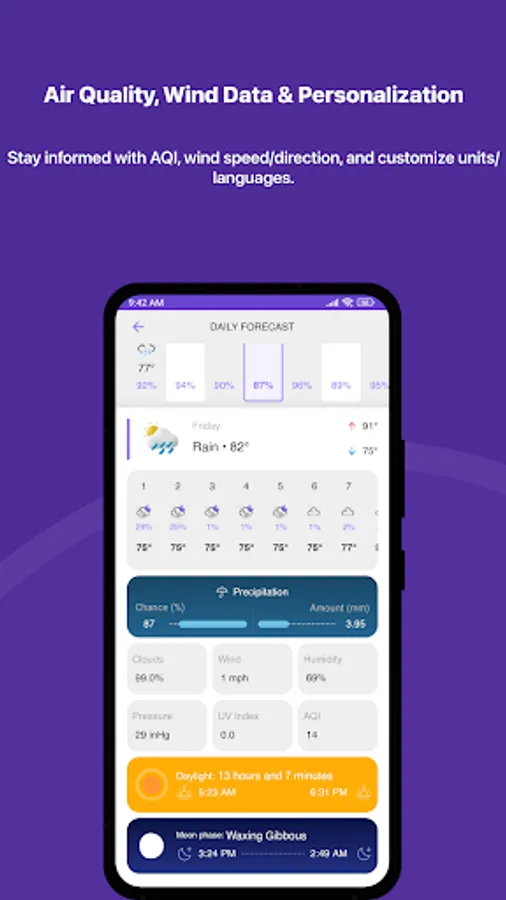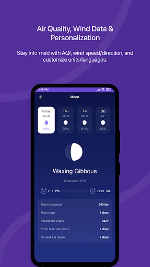 Discover sunrise, sunset, moon phases, and other astronomical information up to 28 days ahead, all presented in a beautiful design.