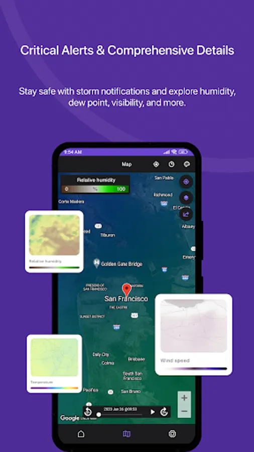 Explore temperature, rain possibility, rain intensity, cloud coverage, pressure, and humidity on a large area using maps for the current and future hours.