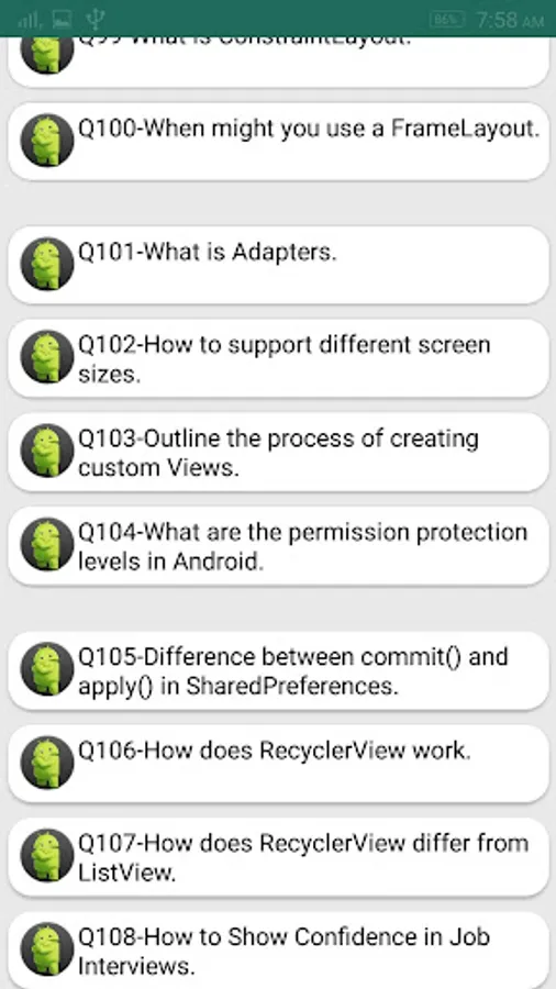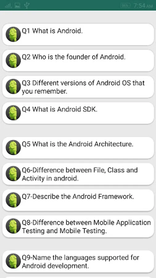 Which include Activity,intent,service,content provider,broadcast reviser,fragments,ANR,linear-layout,relative-layout,frame-layout,Asynk task, and many more, here we provide most asked questions and through research important questions.