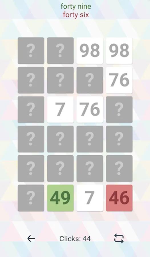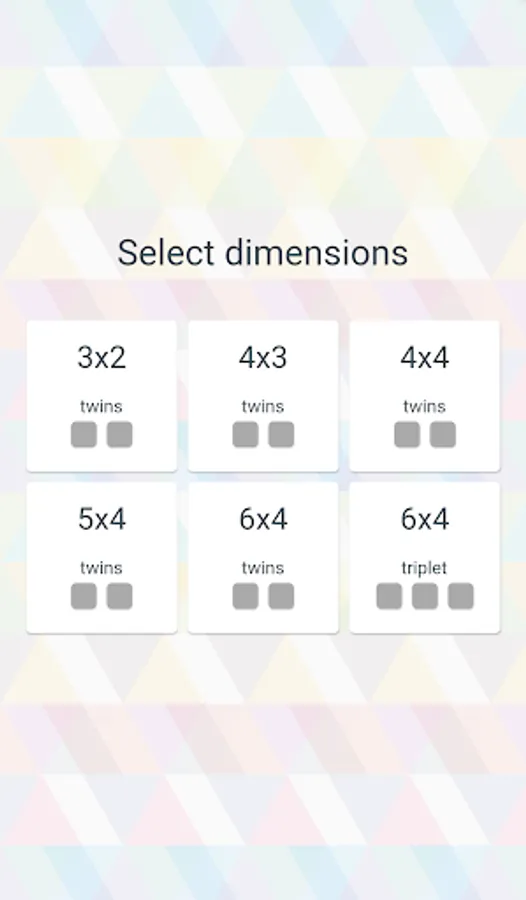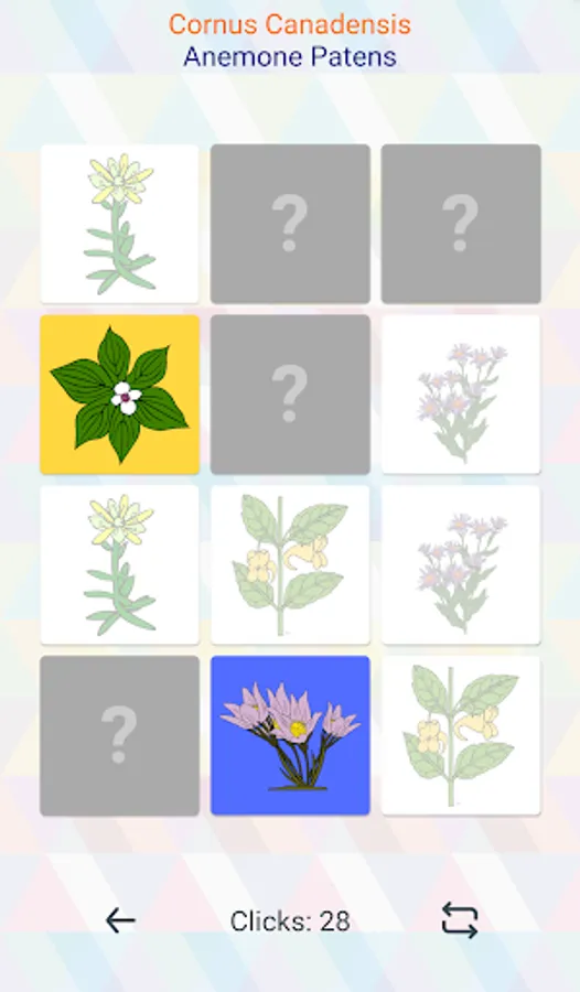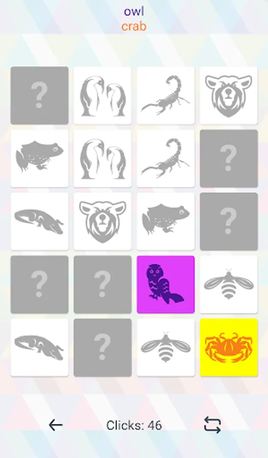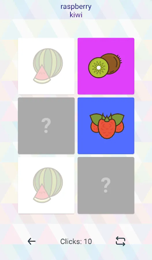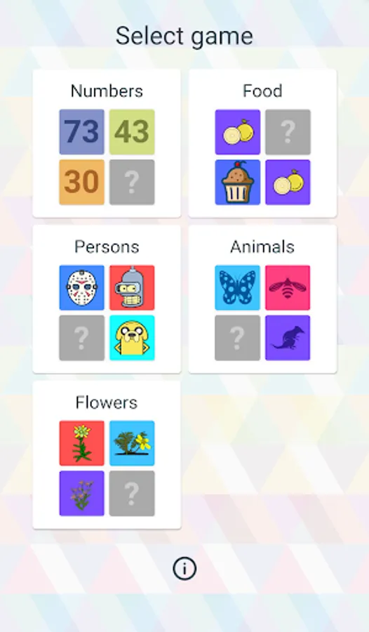 At your disposal are 5 sets of pictures (numbers, animals, flowers, food and movie characters), as well as 6 field sizes (one even involves searching not 2 identical pictures, but 3 at once).