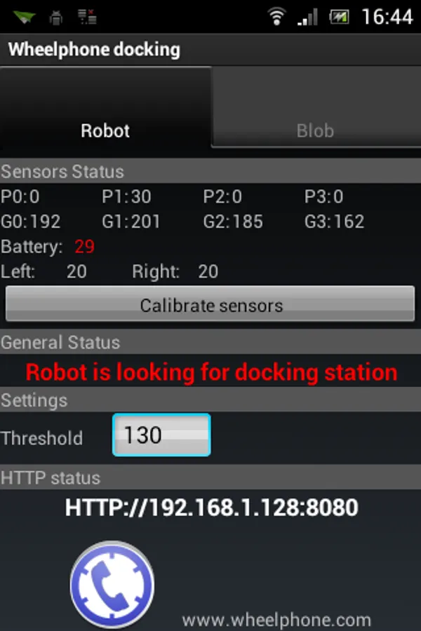 More information about this application, how to use it and the source code are available in the Wheelphone wiki http://www.gctronic.com/doc/index.php/Android_software#Wheelphone_blob_docking.