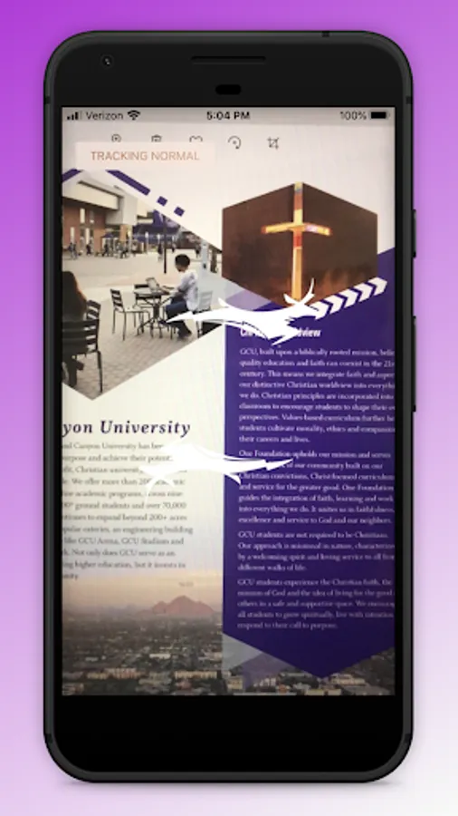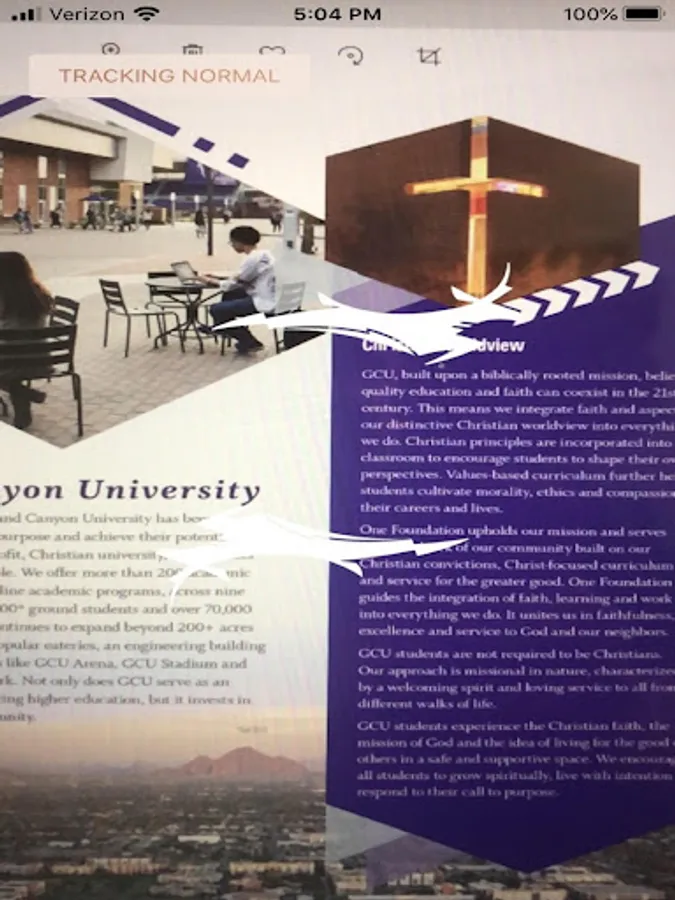 Grand Canyon University is proud to announce a new virtual tour application utilizing augmented reality. By using the camera on your phone, you can now bring select GCU materials and campus locations to life! When you scan a GCU approved trigger, this application will play video content related to your topic of choice. If you don't have access to specific GCU materials or our campus, please use the in-app features to view our content online! 'Lopes Up!