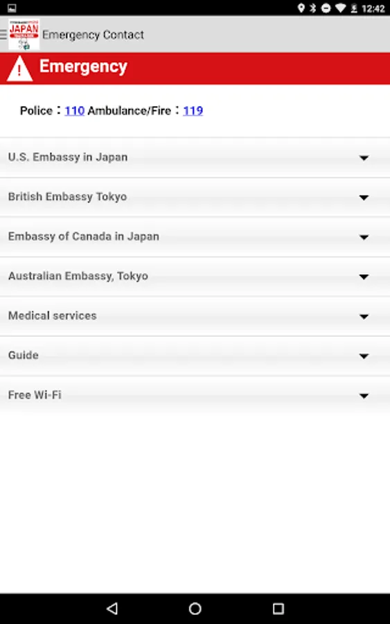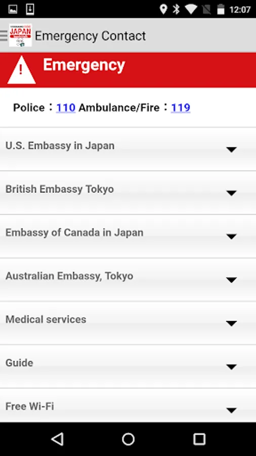 Emergency contact such as Embassies in Japan, police stations and hospitals.