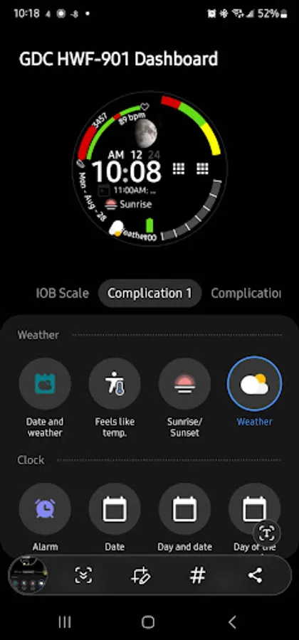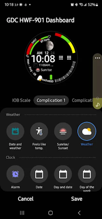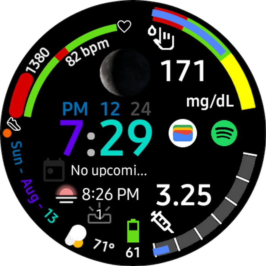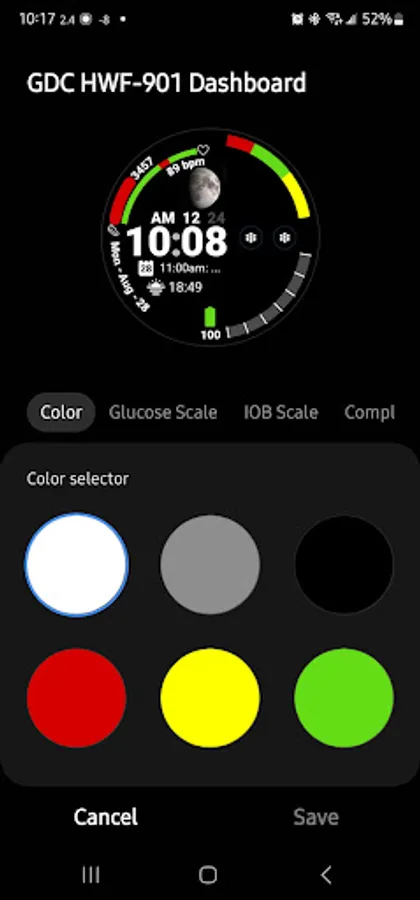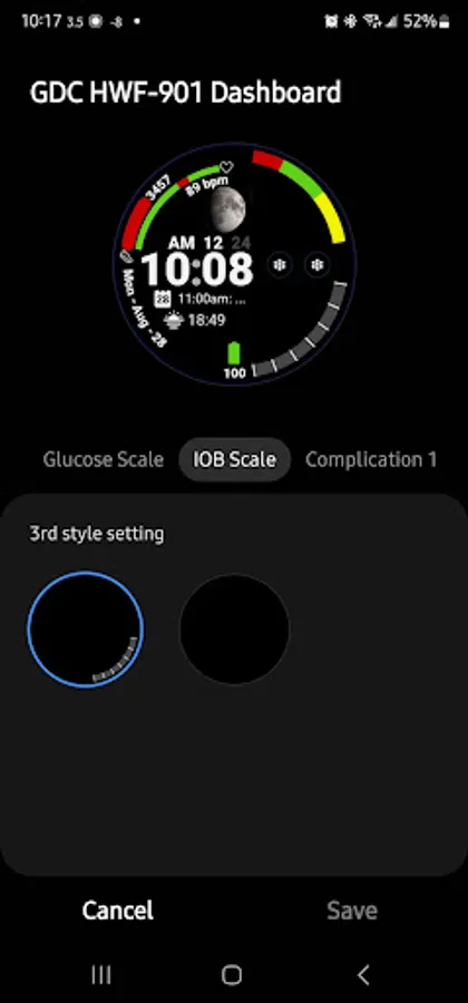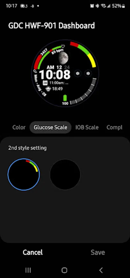 This face GDC HWF-901 Dashboard has everything as a health-conscious diabetic I need. I haven’t seen a watch face that has a scale for either Glucose Levels or Insulin On Board (IOB) Levels. So I decided to create this for the diabetic community. I even used the hex color code ( #5286ff) that represents Diabetes in the progress bars.