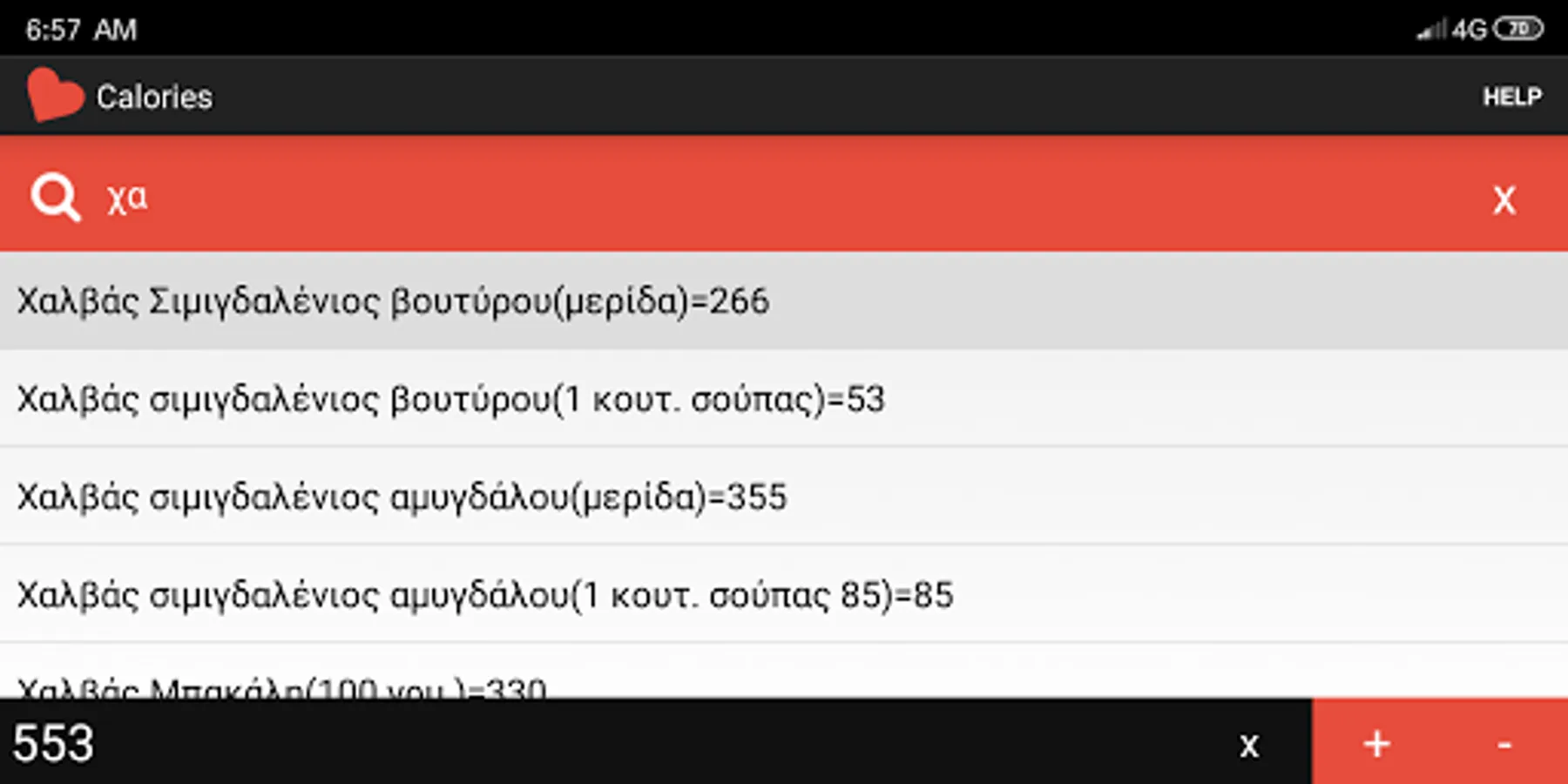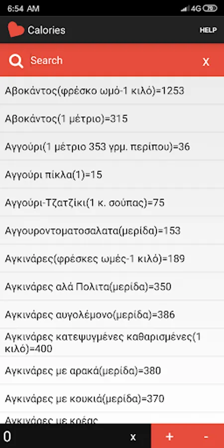 Look for and select your food from the list, press '+' to add calories, '-' to remove calories, 'x' to reset.
