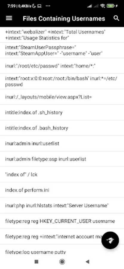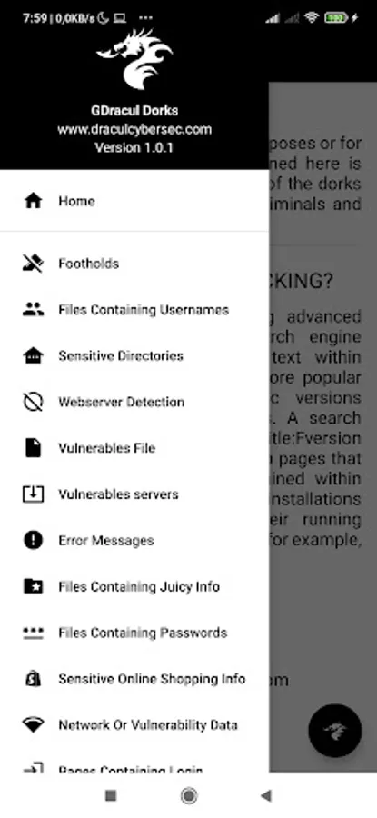 In this application you will have the possibility to see google advanced dorks categorized, such as: "Vulnerable Files" where you will find specific dorks for this category, or even the category "Files Containing Passwords" among several other categories.