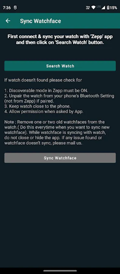 Note: Watch must connected to Amazfit/Zepp Life app while syncing watchface. For Bip 3 & Bip U watch, before syncing watch face from this app, please remove one or two old watch face from watch to make space for new.