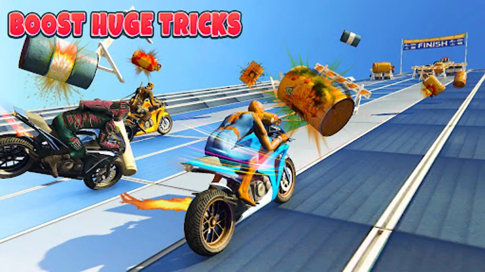 Enjoy extreme bike jumps, moto bike stunts, tricky and crazy bike stunts, speed stunts, bang stunts on impossible tracks full of hurdles like footballs, colorful bottles etc. Play through all the modes and levels of Superhero Tricky Bike Racing. Hit items and balls on the mountains and mega ramps and avoid falling off from the mountains in this motocross bike racing and motorcycle game. Real bike racing game is a must have game for all bike racing lovers and bike champions and for the fun of bike riders!