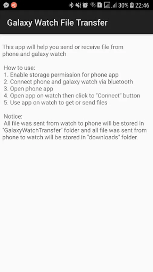 All file was sent from watch to phone will be stored in "GalaxyWatchTransfer" folder