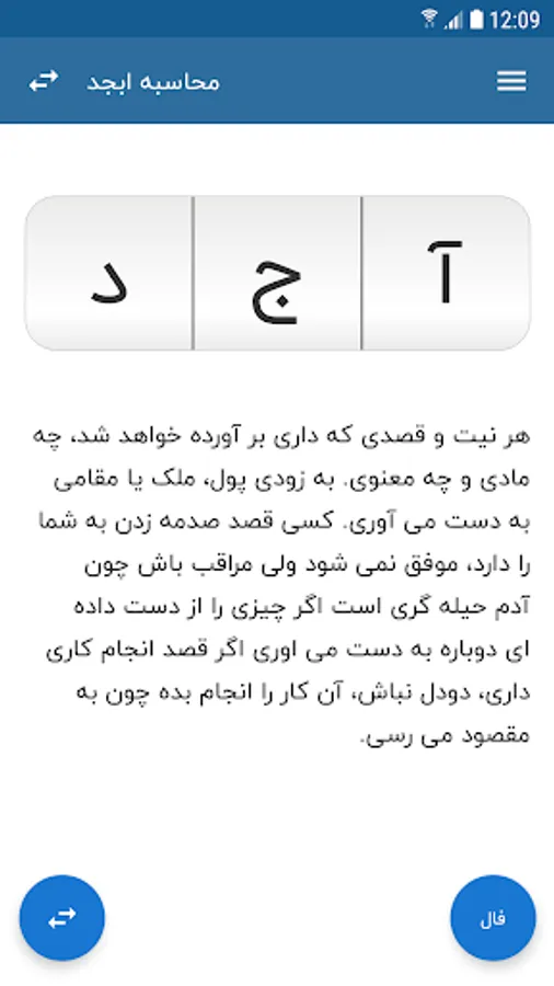 With this application you can convert any word to its equal in both "Kabir" and "Saqir" types of Abjad. And also you can benefit from Abjad fortune telling in the application.