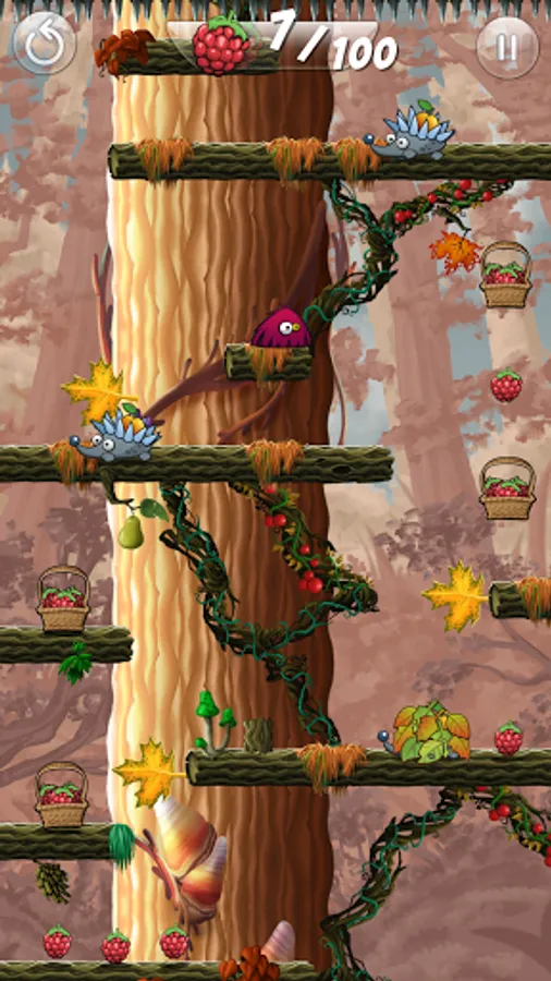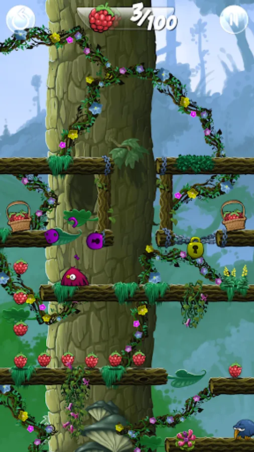 After a dramatic escape from the cage of evil birds, a cute furry creature must travel through a forest full of dangers to return to his beloved. By jumping on lower and lower branches, watch out for birds and collect fruit from hard to reach places. Discover new sceneries with beautifully designed levels. See what you can do and unlock all achievements.