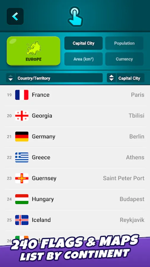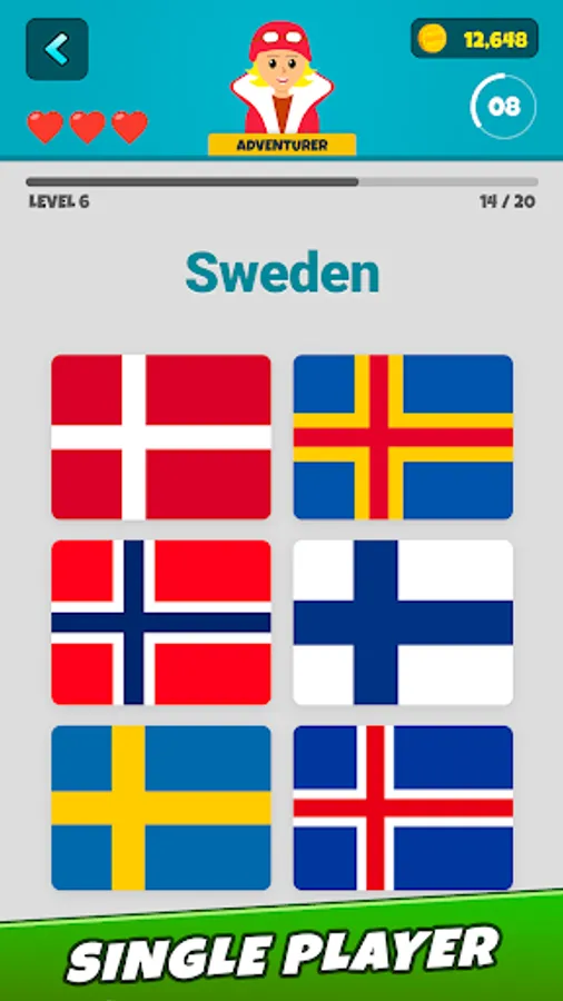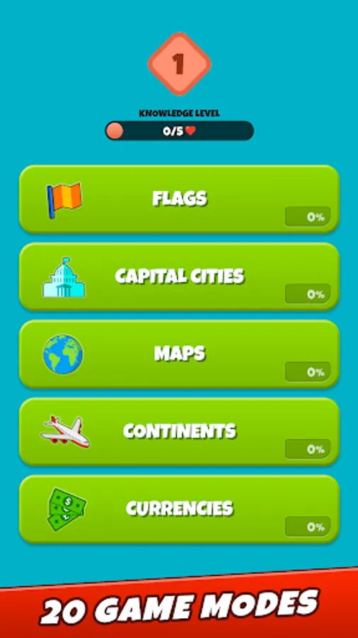 With 15 levels to finish in every game type, this game gets progressively harder as you advance. Each level has 20 country flags, capital cities, maps, continents, or currencies, and you have just 20 seconds to match the flag or country/state for each question. You'll also learn details like populations and areas while guessing, making this game an excellent way to learn while you play.