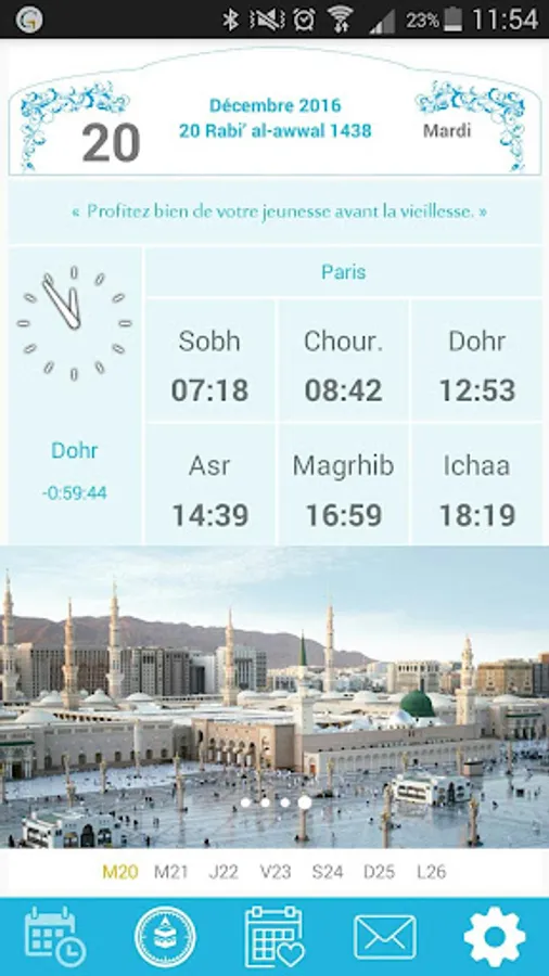 The schedule of Fajr was calculated on the basis of 12 ° before sunrise. The schedule Maghreb was calculated based on data from observatories French, with 5 more minutes as a precaution for time of Fajr, the Dohr and North Africa.