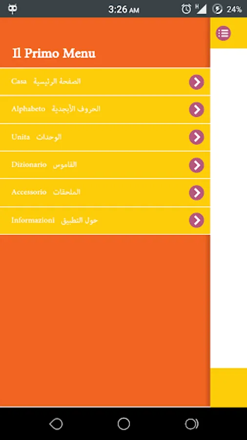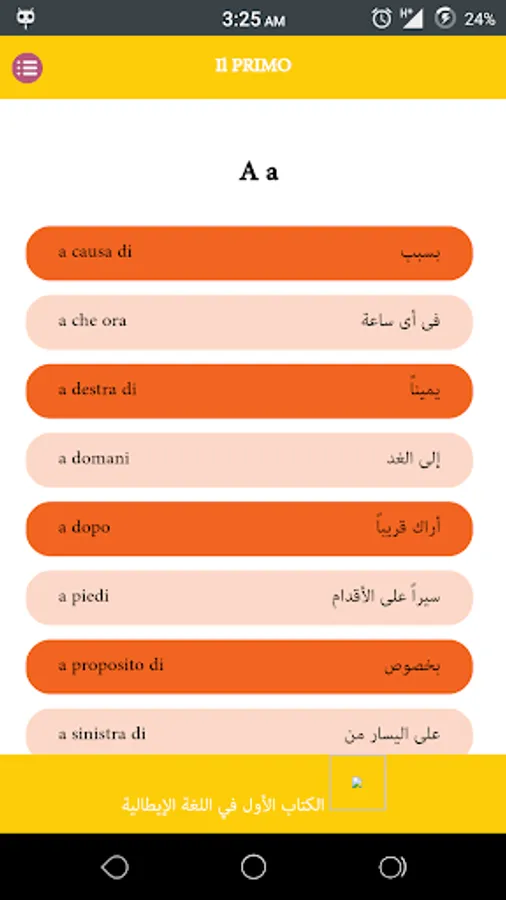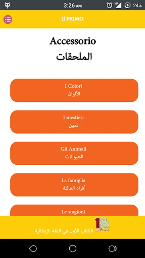أسماء الحيوانات والوظائف والألوان مكتوبة باللغة الإيطالية ومترجمة باللغة العربية ومنطوقة باللغة الإيطالية بشكل واضح وسليم .