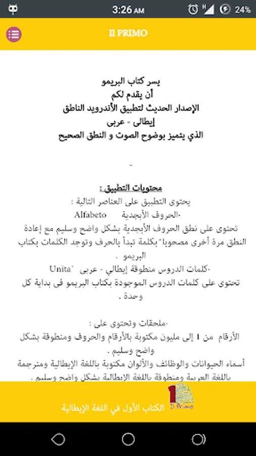 تحتوى على نطق الحروف الأبجدية بشكل واضح وسليم مع إعادة النطق مرة أخرى مصحوبا ً بكلمة تبدأ بالحرف وتوجد الكلمات بكتاب البريمو .