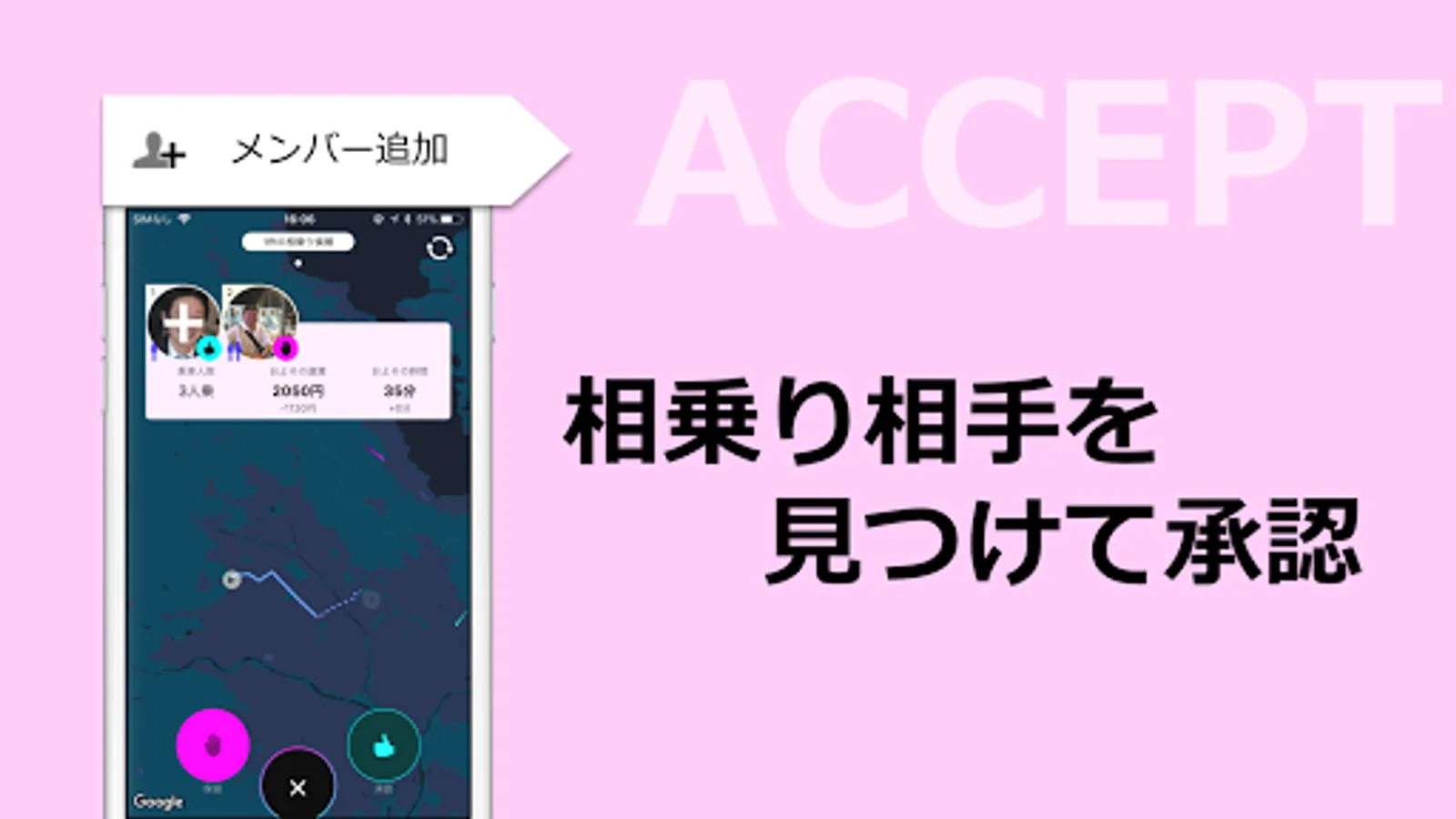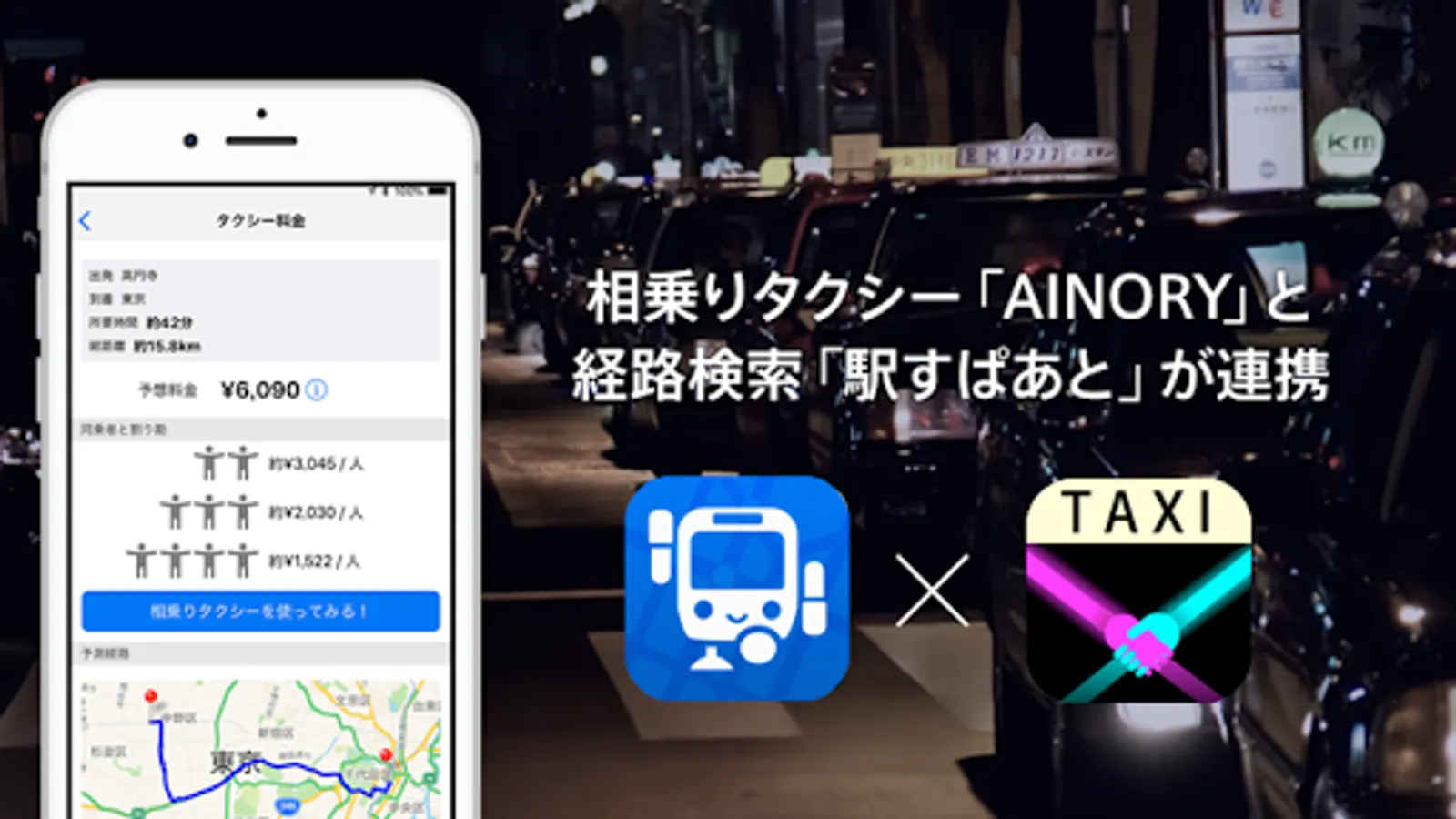 For example, by increasing the number of shared members to four, a taxi fare of 4000 yen can be reduced to 1000 yen, saving up to 70%.