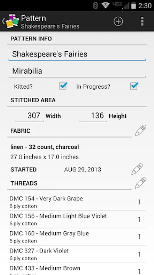 Of course, you can also keep track of when you started a project and what fabric that particular finish was on, as well as the substitutions you made. And your data is always yours! Easily export it as a human-readable text file for back-up or sharing. Export just the information for one pattern to share with fellow stitchers. A built in fabric calculator tells you what size fabric you need for the pattern, based on defaults you enter. The best part? It's all free to you!