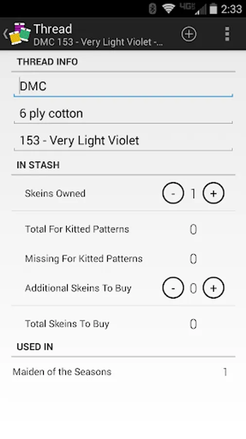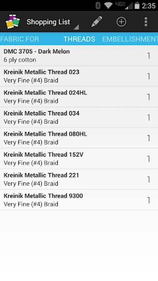 Enter StashCache. Written by a cross stitcher for cross stitchers, this app aims to help you keep track of what you own and what you need for your next pattern. Enter information directly into your phone or tablet, or type it up on your computer and import it! If you input the materials list for a pattern, you can mark it as kitted and the app will check your stash to see what supplies you don't have on hand.