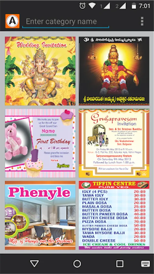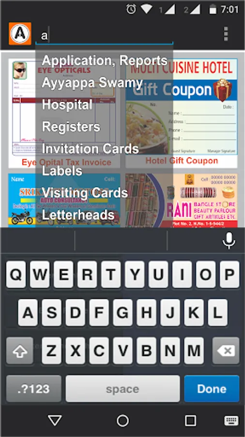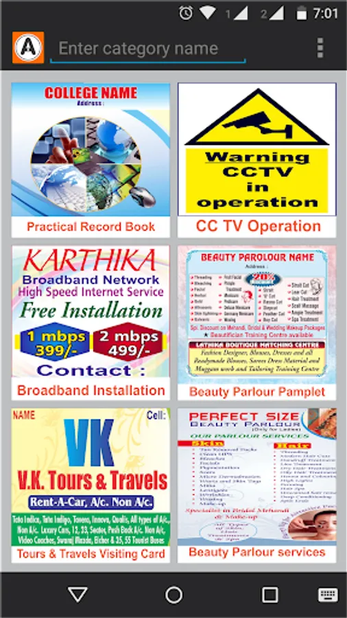 (1) Applications, Reports (2) Ayyappa Swamy (3) Birthday Cards (4) Calenders (5) Certificate (6) Death Anniversary Cards (7) Devotional (8) Envelope Covers (9) Hospital and Health (10) Hotel, Lodging, Catering Menu (11) House warming Invitations (12) Identity Cards (13) Invitation Cards (14) Invoice, Cash Memo, Bill, Quotation (15) Labels (16) Letterheads (17) Logistic Transport (18) Notebook Titles (19) Others (20) Pamphlets, Leaflets, Flyers (21) Photo Studio and Beauty Parlour (22) Receipts, Vouchers, Delivery Chalan (23) Registers (24) School, College, Institutions (25) Symbols (26) Tours and Travels (27) Visiting cards (28) Wedding Cards