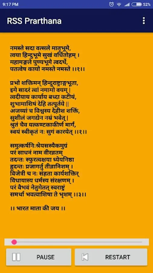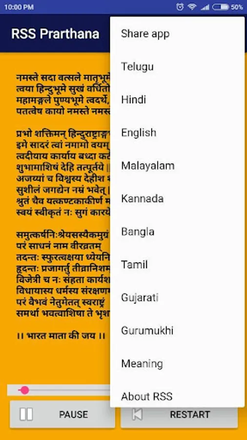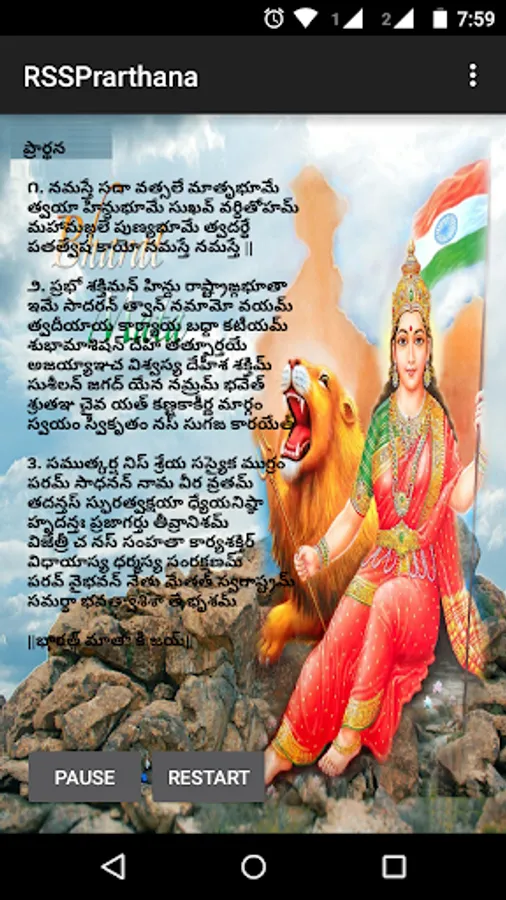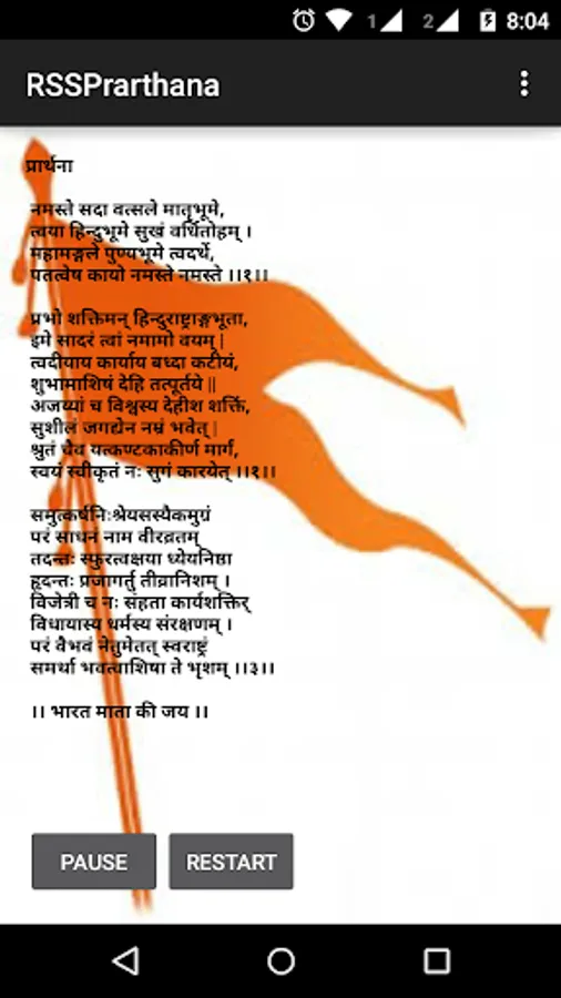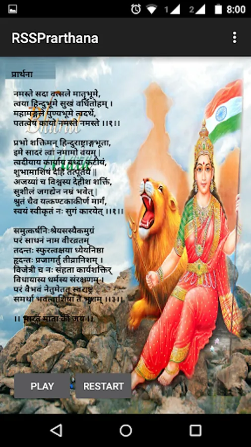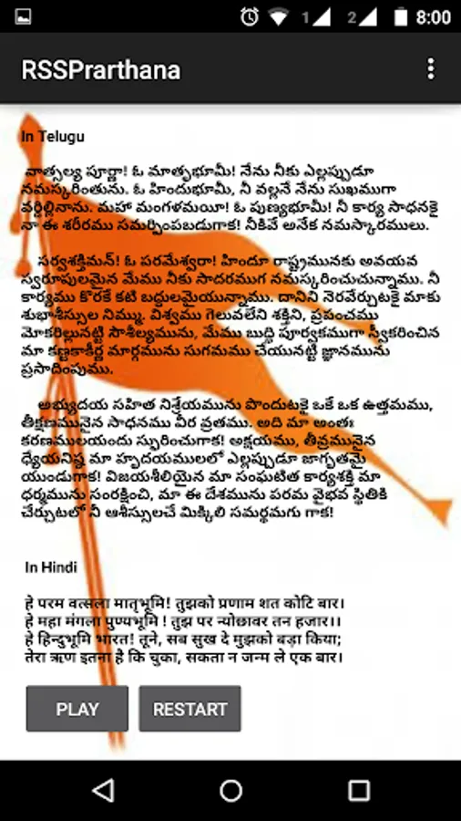 RSS Prarthana is the main origin and strength for swayamsvaks to achieve their goal. This is an app which can used to practice the RSS prayer by seeing prayer text in Telugu, Hindi, English, Malayalam, Kannada, Bangla, Tamil, Gujarati, Guruukhi, Bengali and Odia languages. Sangh prayer contains 3 shloka's which is written in sanskrit language, first shloka tells about the meaning of Rashtriya , second shloka tells about the meaning of Swayamsevak and third shloka tells about the meaning of Sangh . This app can be used for those who recently joined RSS swayamsevaks to learn sangha prarthana and it's maning.