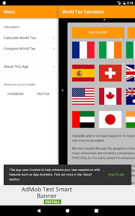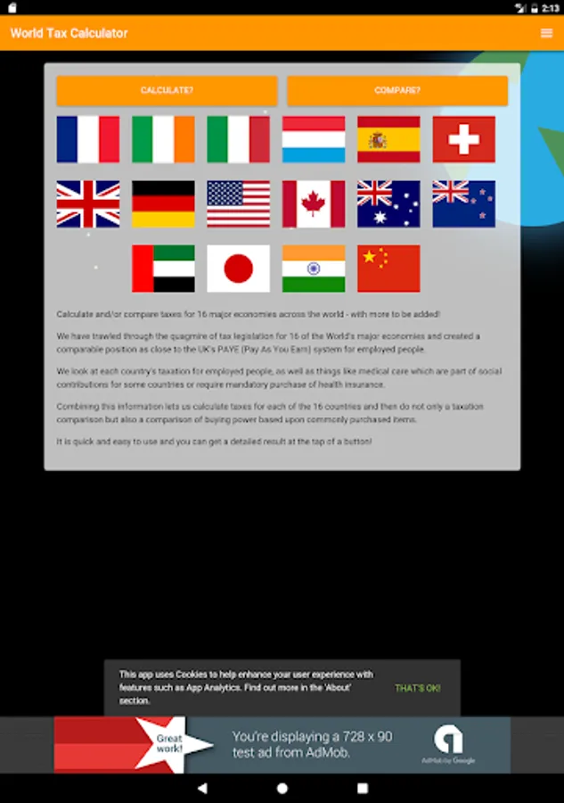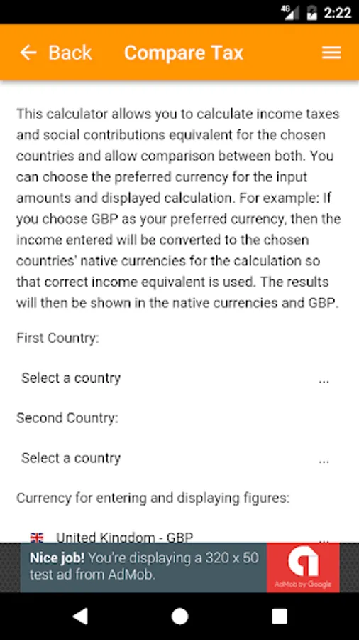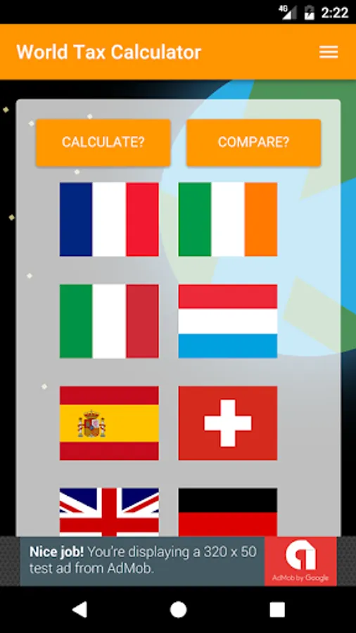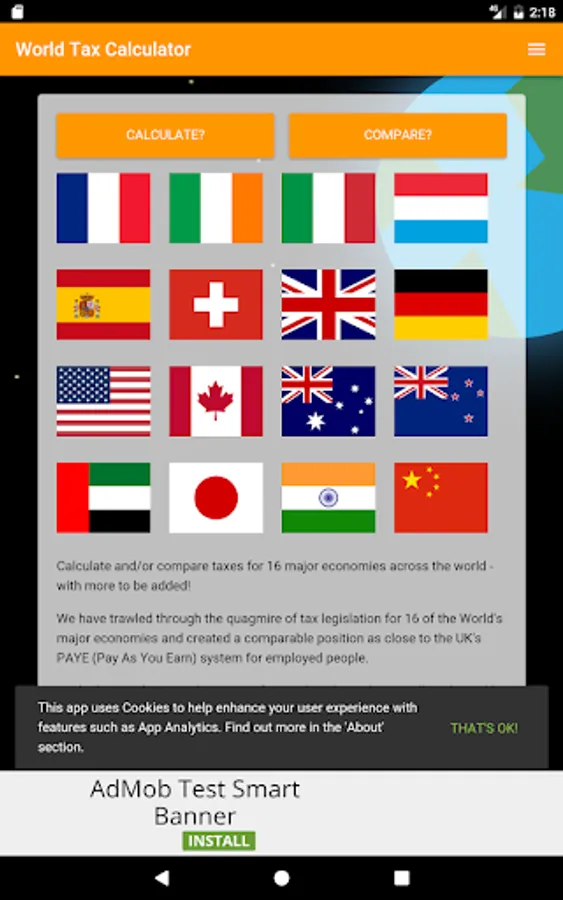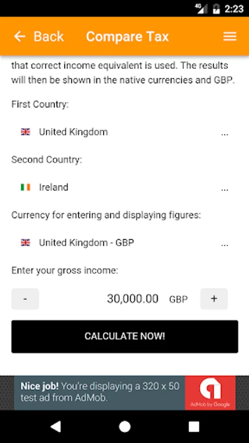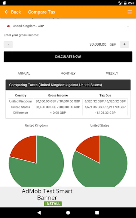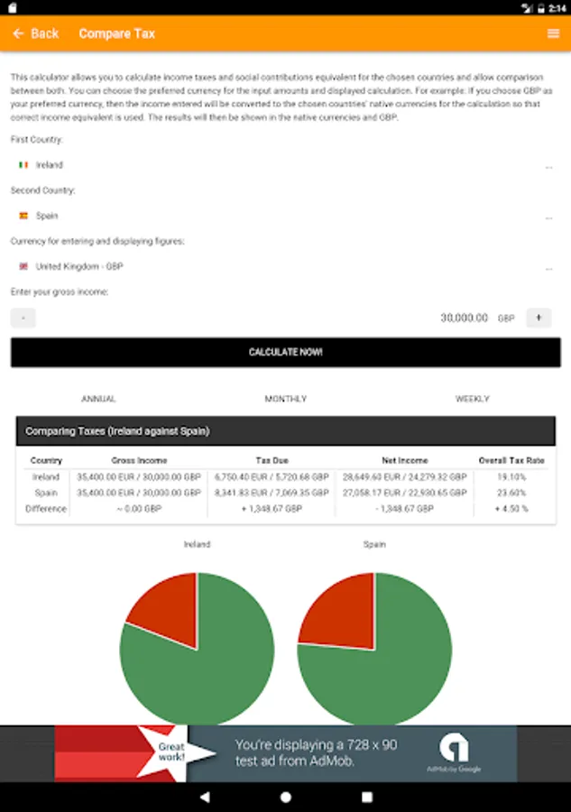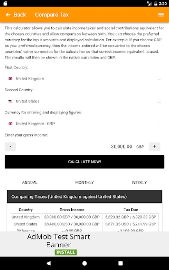 The app will quickly calculate and compare France tax, Ireland tax, Italy tax, Luxembourg tax, Spain tax, Switzerland tax, United Kingdom tax, Germany tax, United States tax, Canada tax, Australia tax, New Zealand tax, Japan tax, India tax, China tax and United Arab Emirates tax.