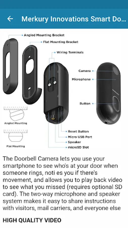 Merkury Smart Video Doorbell Camera lets you use your smartphone to see who's at your door when someone rings, noti es you if there's movement, and allows you to play back video to see what you missed.