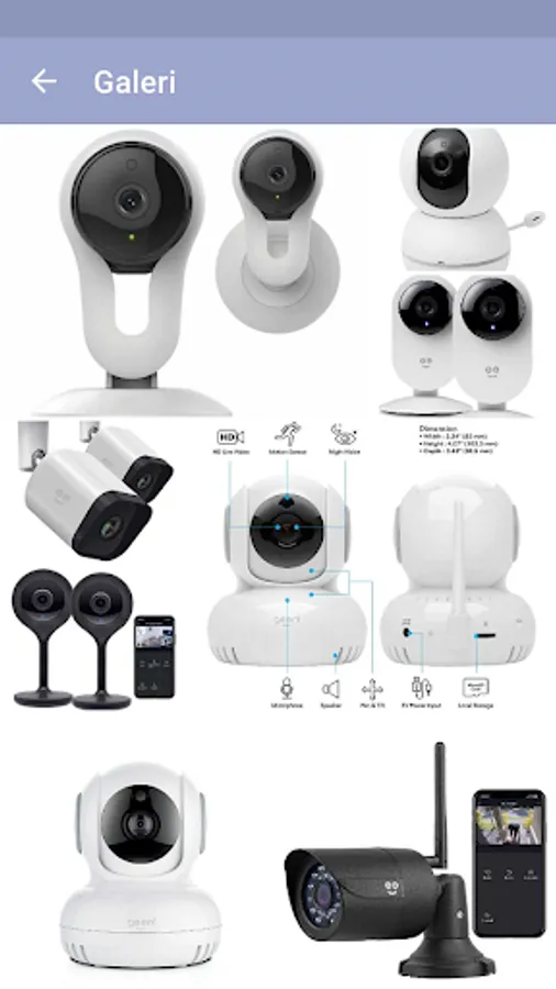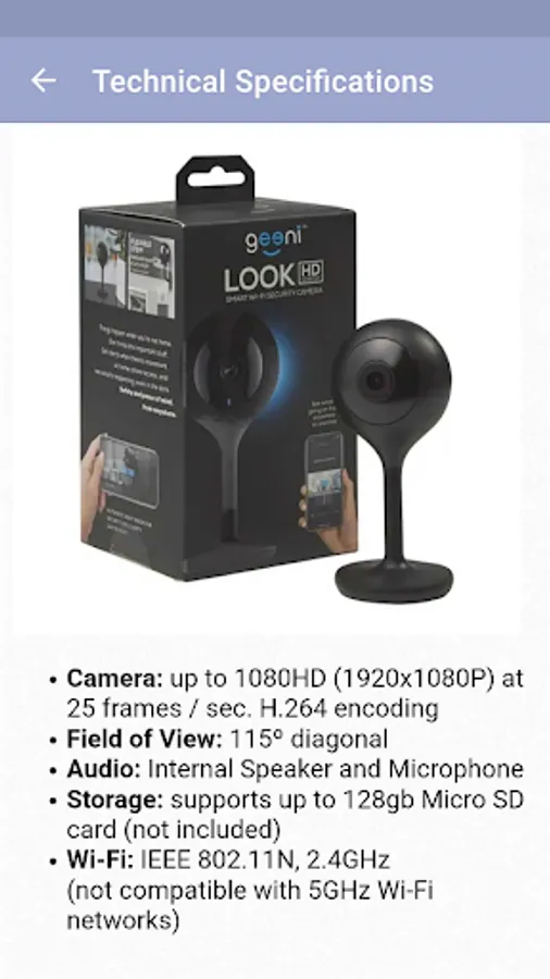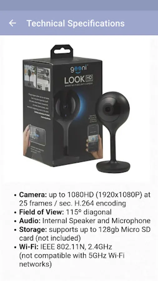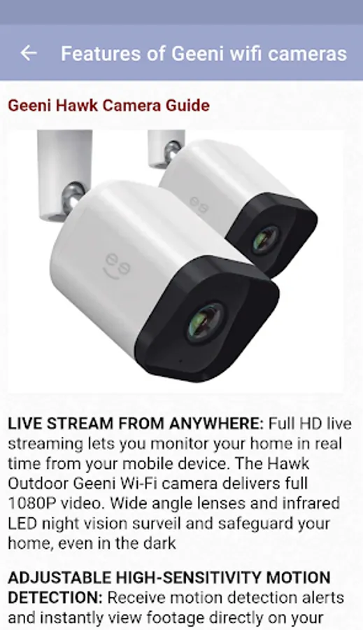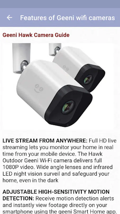 There are explanations such as geeni wifi camera features, how to set up, mounting be found on the app. Geeni camera has different models for both indoor and outdoor. Geeni Sentinel has pan and tilt feature, Glimpse and Aware models have HD display features. As an outdoor camera, there is the Geeni Hawk with waterproof feature.