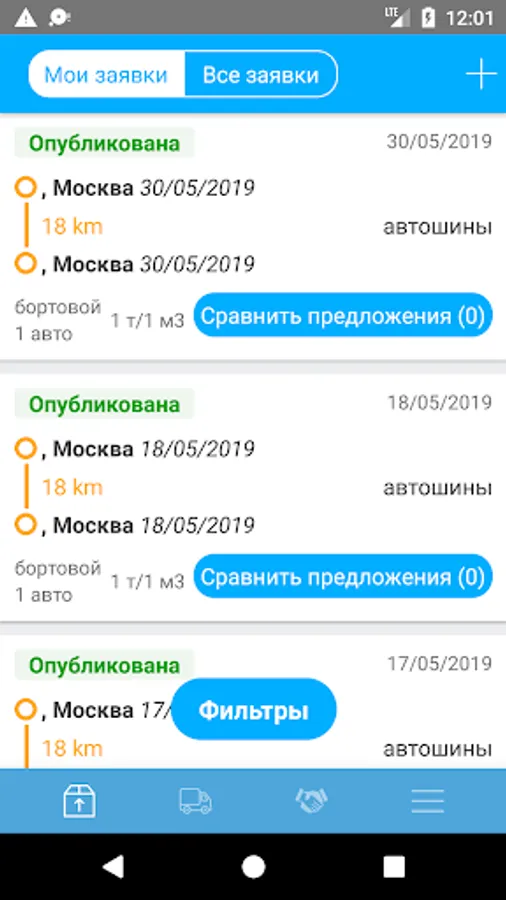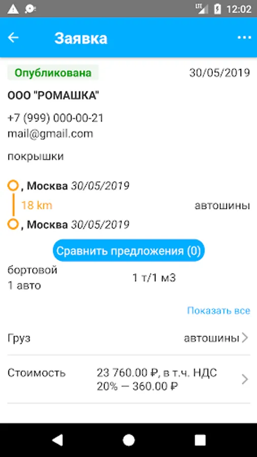Web service and a functional mobile application for placing cargo and searching for contractors and solving business problems related to FTL cargo transportation for legal entities.