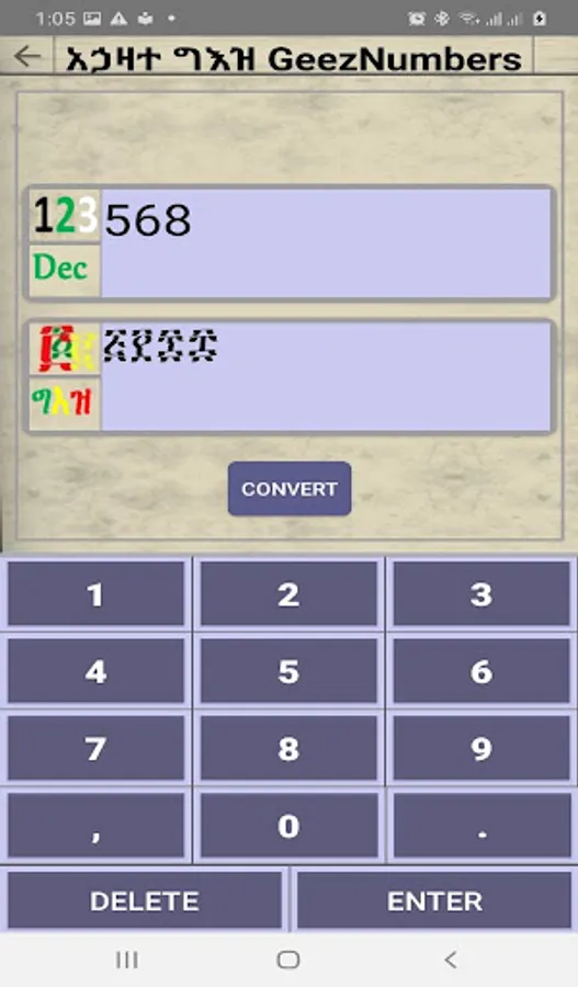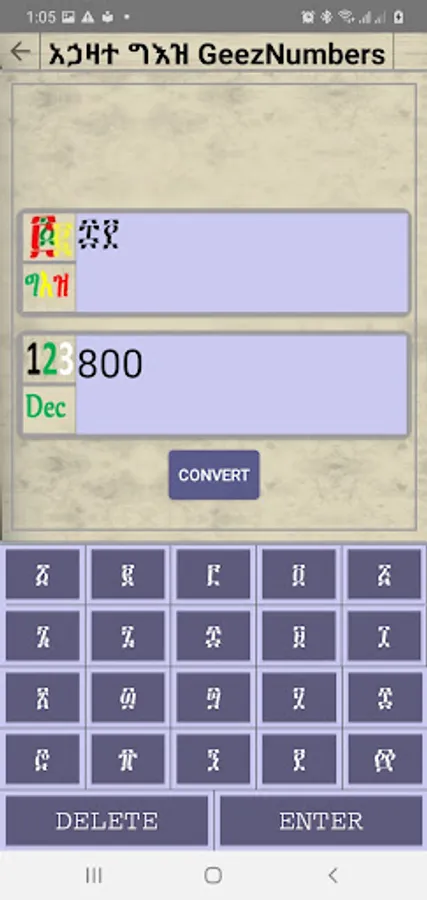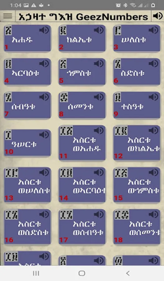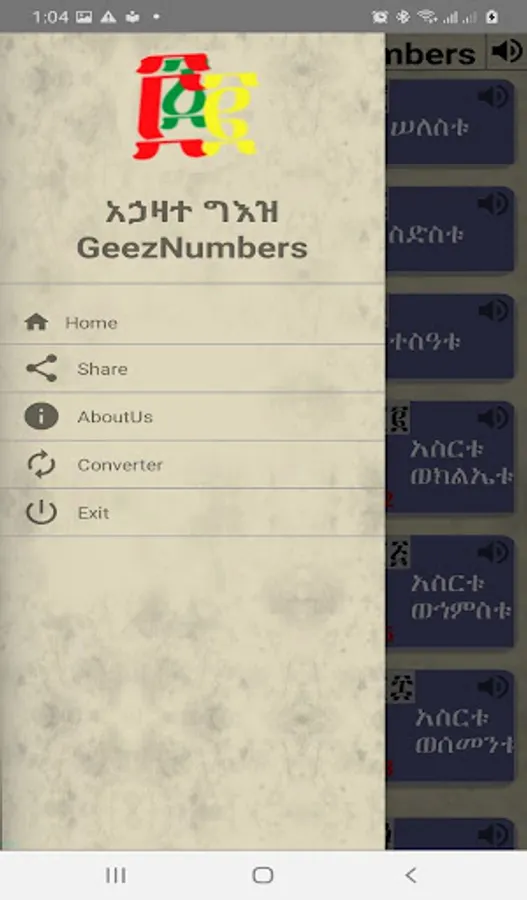 ይህ መተግበርያ የ ግእዝን አኃዛት ለመማርያ የተሰራ ሲሆን በ ድምጽ እና ጽሁፍ እንዲሁም የ አረቡን አኃዝ አካቷል፡፡ እንዲሁም ማንኛዉንም የ ግእዝ አኃዝ ወደ አርብ (ኢንቲጀር) መቀየርያ ና ማንኛዉንም የ አርብ (ኢንቲጀር) ወደ ግእዝ አኃዝ መቀየርያ አካቷል፡፡