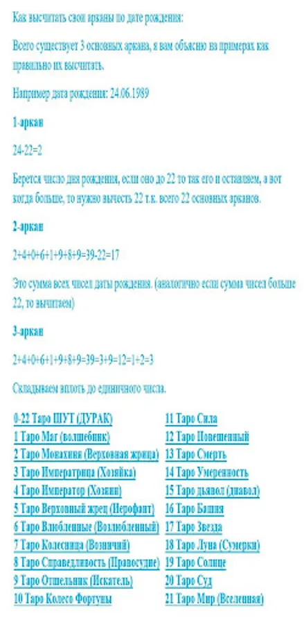 Automatic calculation of arcane tarot by date of birth, training.