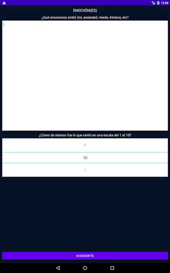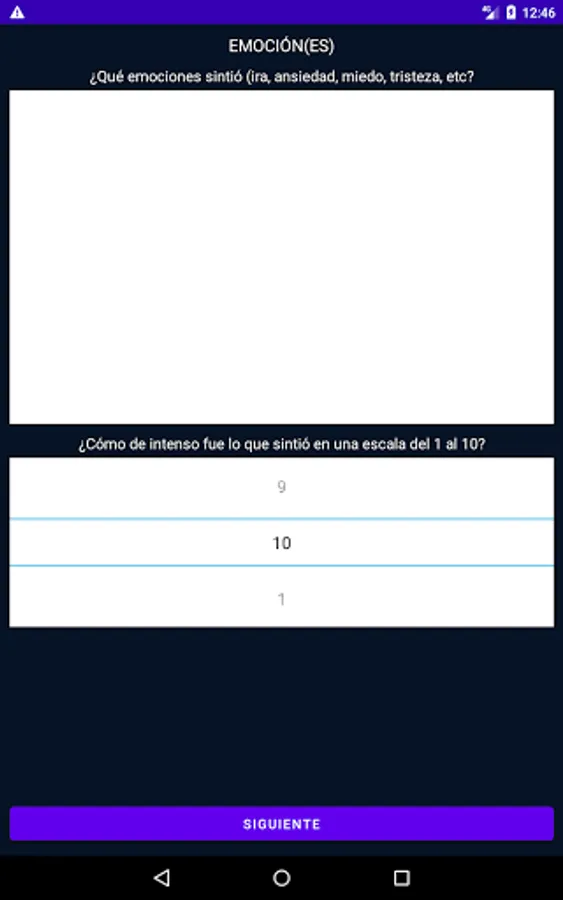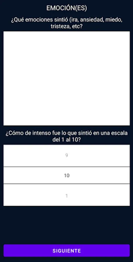 Another block to identify what emotion or emotions you have felt as a reaction to the situation, they can be of the type anger, sadness, anxiety, shame, happiness, fear, worry, anger, disgust, envy, nostalgia, sympathy, etc ... After identifying the emotion there is a field to indicate the intensity level that you felt of that emotion valued on a scale of 1 to 10, where 1 means no intensity and 10 very much.