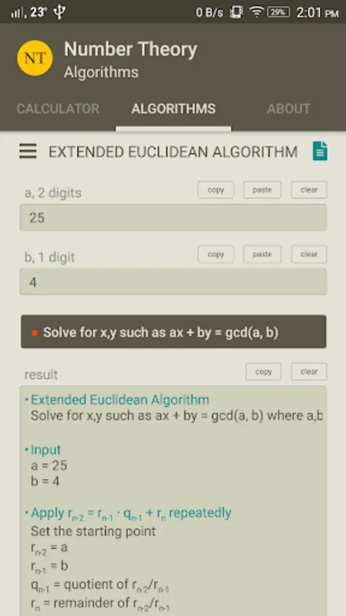 Extended Euclidean Algorithm. Solve for x, y such as ax + by = gcd(a, b).