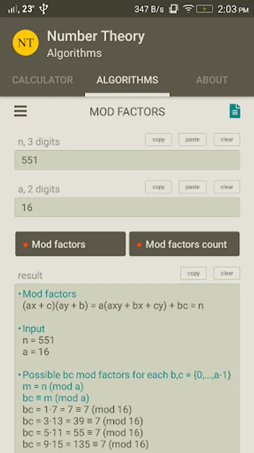 Mod Factors. Calculate modular possible factors for a given number and a modulo. Find n ≡ bc (mod a) where (ax + c)(ay + b) = a(axy + bx + cy) + bc = n.