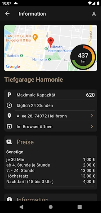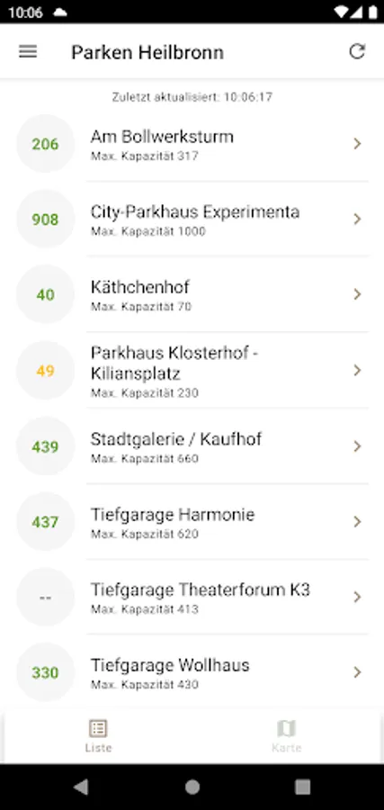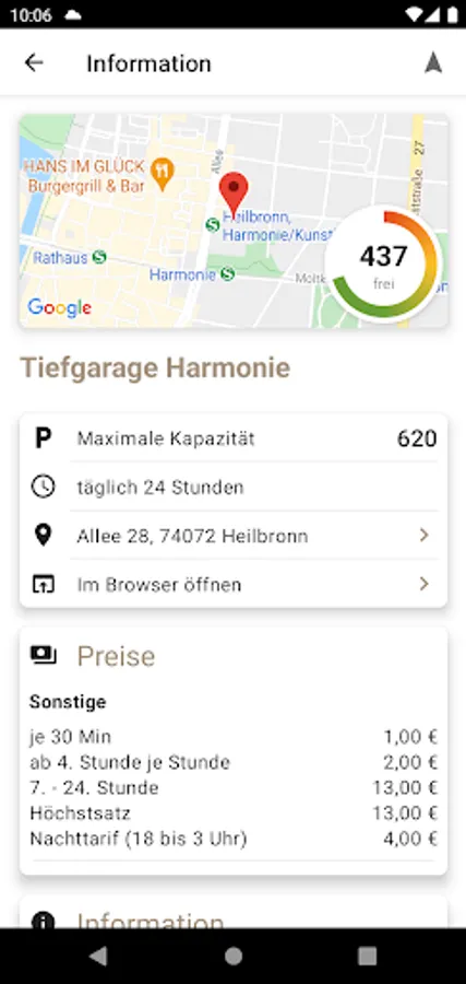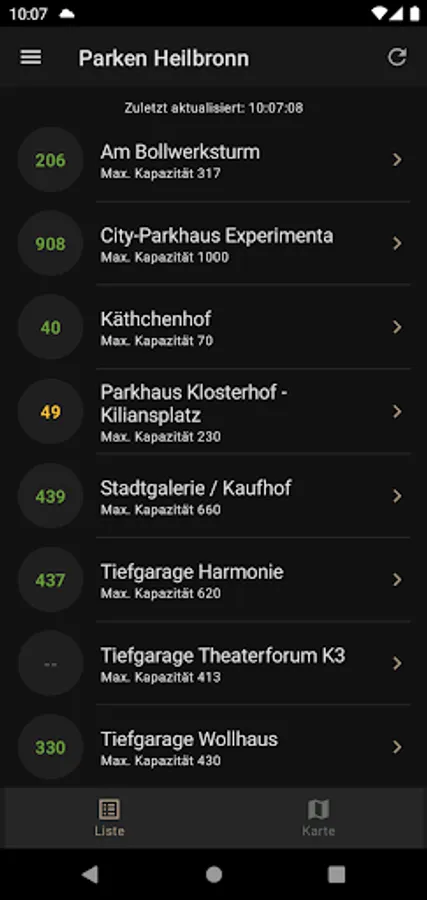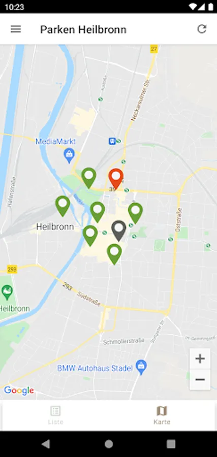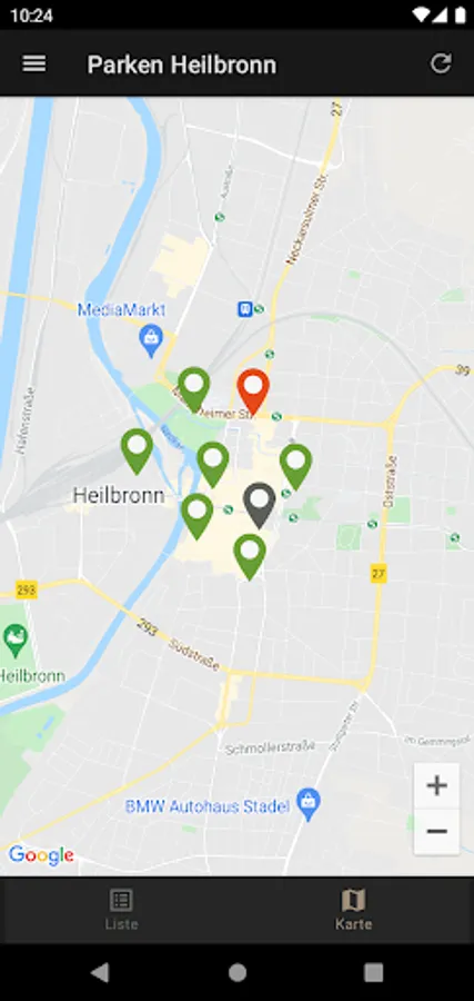 Parking Heilbronn shows information about multi-storey car parks, underground garages and parking lots in Heilbronn. If available, the current occupancy and number of available parking spaces are displayed in real time.