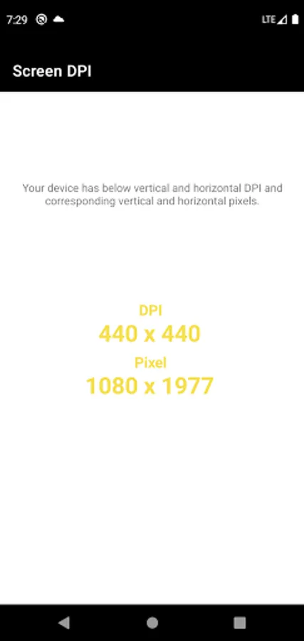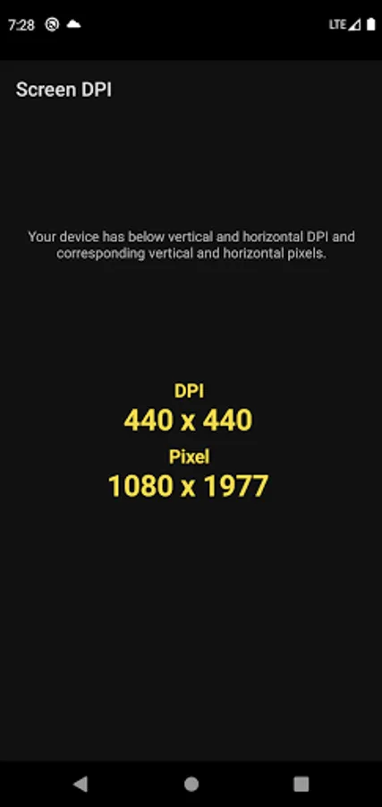 DPI (dots per inch) and resolution in pixel will be displayed in the middle of the screen, taking current settings and orientation of your device.