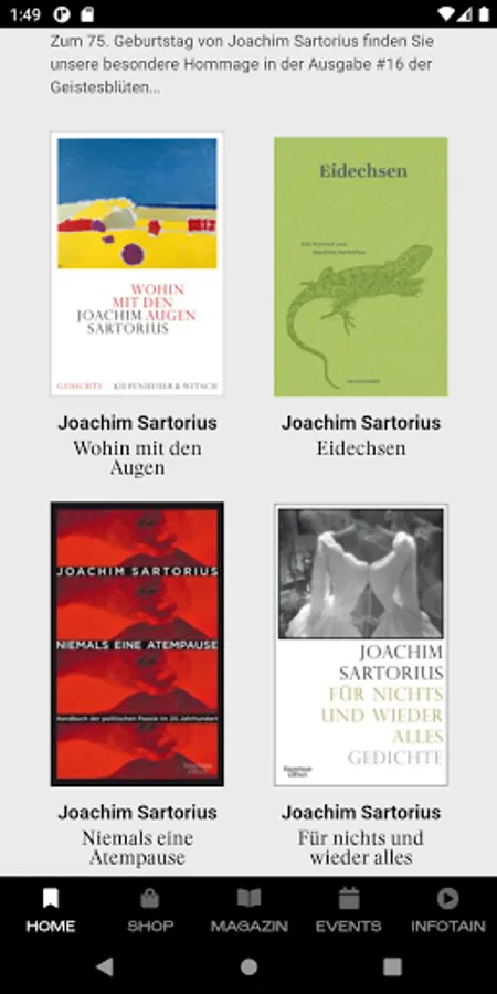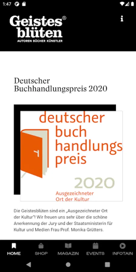 App into the colorful world of literature! Various recommendations and the magazine for smartphones and tablets: interactive, multimedia and unique. Use numerous functions of the digital edition of the Geistesblüte and find out about current and important books anytime and anywhere, use the convenient ordering options, book yourself in our Berlin live events and online formats and learn the story behind the stories in the diverse infotainment the cultural workers presented by Christian Dunker and Marc Iven.