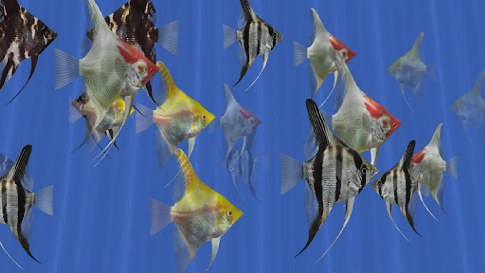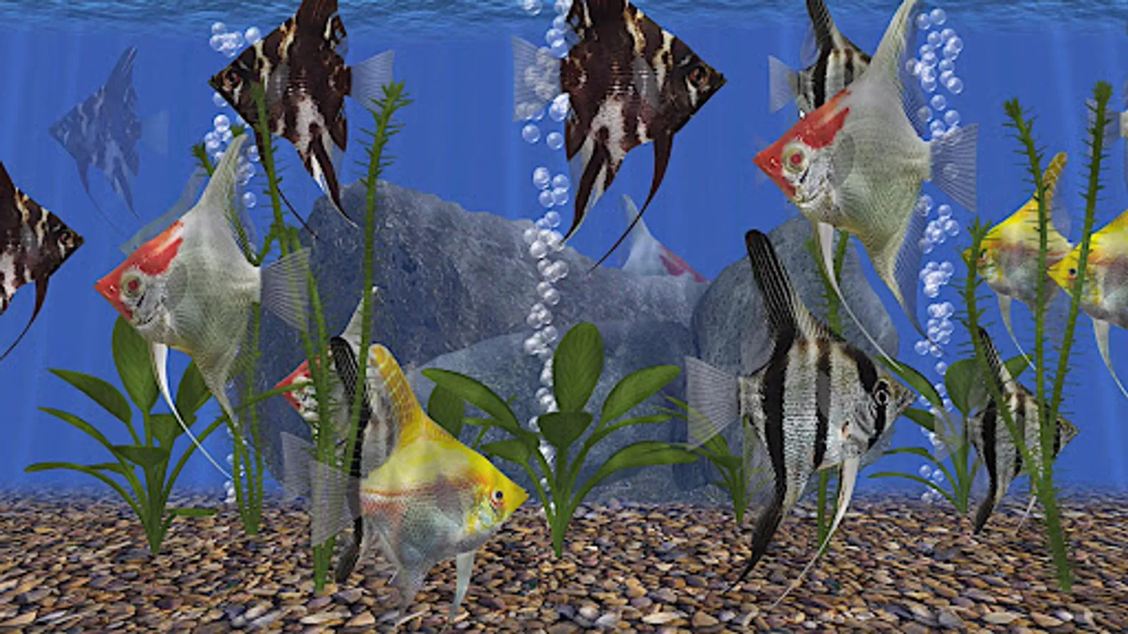 3D angel fish aquarium for Android TV or smartphone includes a freshwater fish tank with tropical fish swimming among animated underwater plants, light rays and small air bubbles rising up. Fish species include the red-cup white albino angel fish, silver altum sangel fish, gold angel fish and black marble angel fish . All swimming fish and underwater backgrounds are in original 4k HD 3D quality and you don't need to have real freshwater aquarium fish or download and playback a swimming fish video from yuotube.
