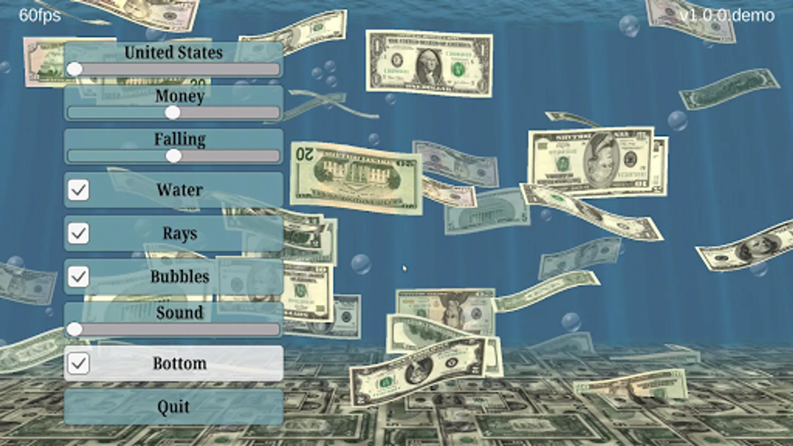 Fill your screen background with visual effects of 3D moving paper money bills from the US dollar, European euro, British pound sterling, Russian ruble, Chinese yuan, Australian dollar and Canadian dollar. Easy decorate your Android TV set, TV box, tablet or phone with real paper world currency money bills falling, raining and swimming among underwater backgrounds, light rays and animated small air bubble. All scattering money banknotes are in original (4k or Full HD) 3D quality without need to have world real money banknotes and download and play a large looped falling money video. For all fans of money game for kids or without make money gambling online.