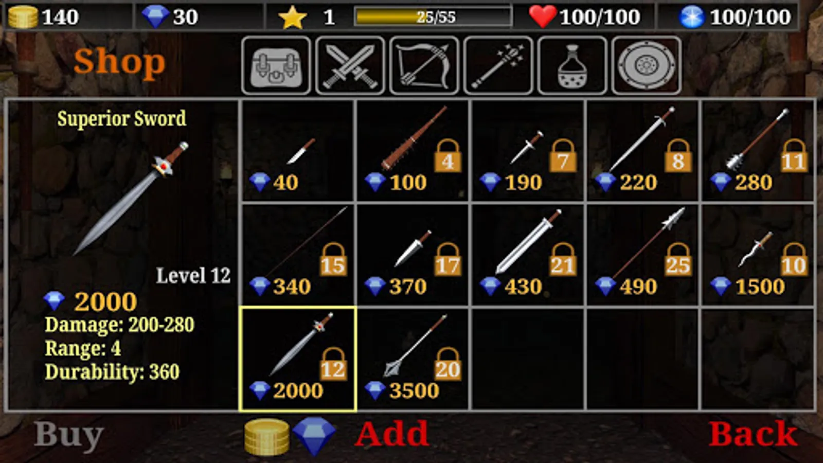 You will start your first quests with one of the medieval weapon like: 1 old broken sword, 2 tomb rocks, 3 dungeon hunter bow, 4 assassin's throwing knives, 5 knight's sword, 6 flicker dagger, 7 barbarian raider's mace, 8 heretic's magic staff and 9 spear of doom.