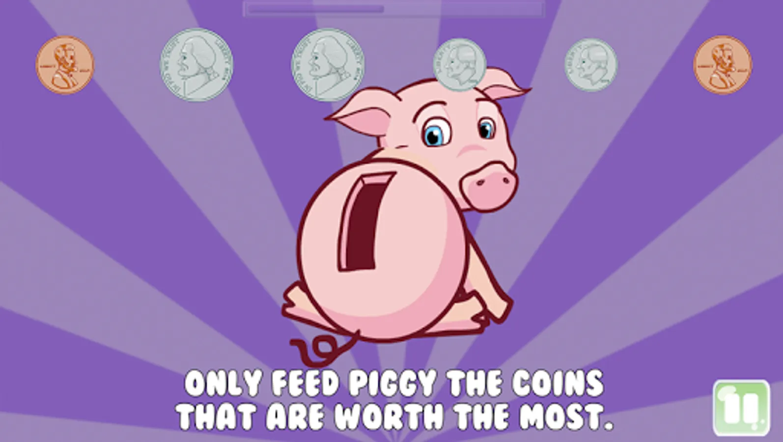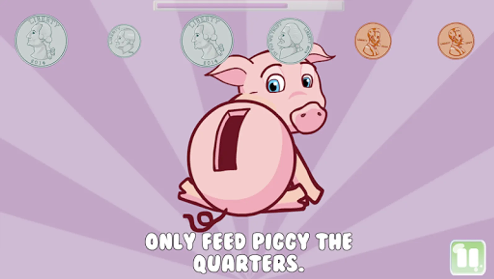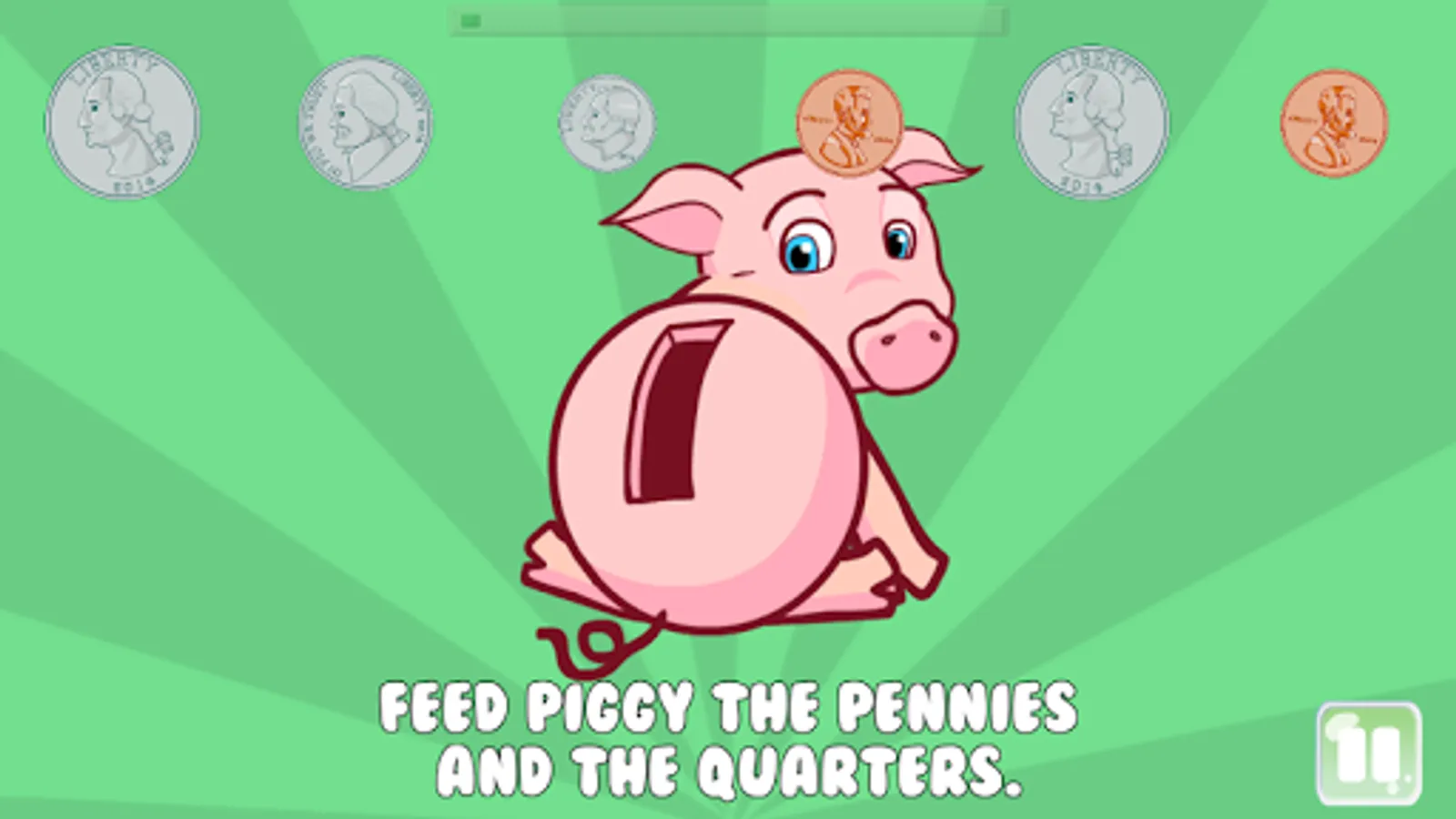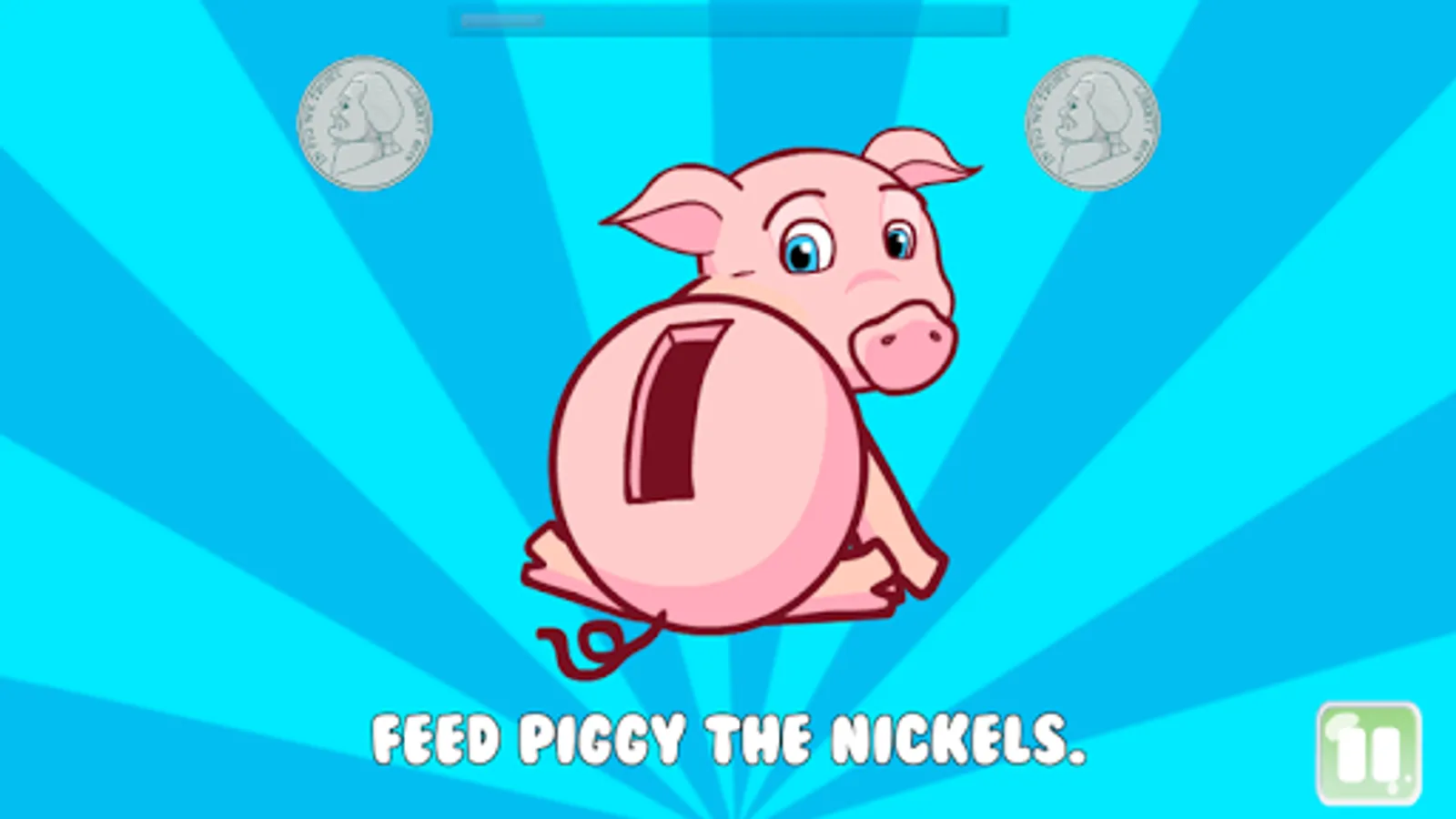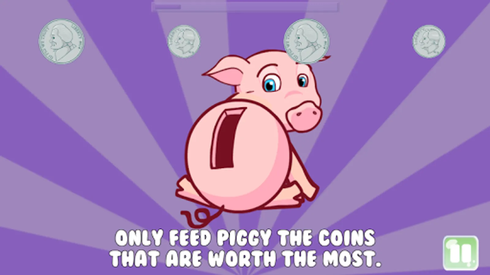 Saving with Piggy is a educational game that helps young children (age 2 to 5) learn about coins by feeding piggy (aka, putting coins in the piggy bank). The game features Piggy, a lovable animated piggy bank that needs help saving coins.