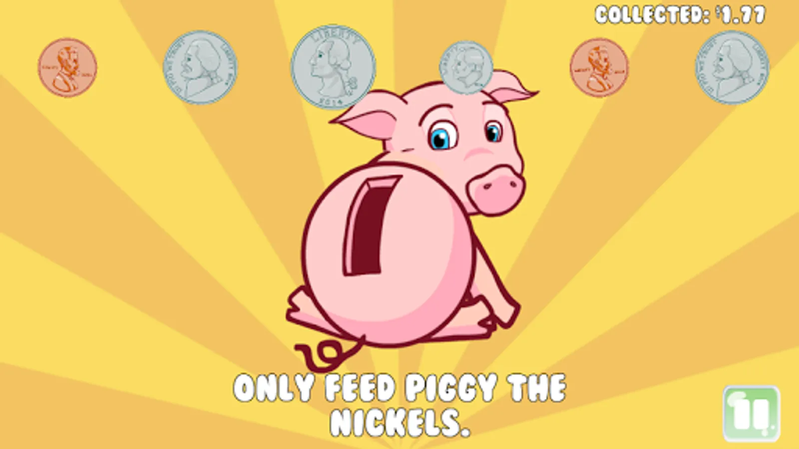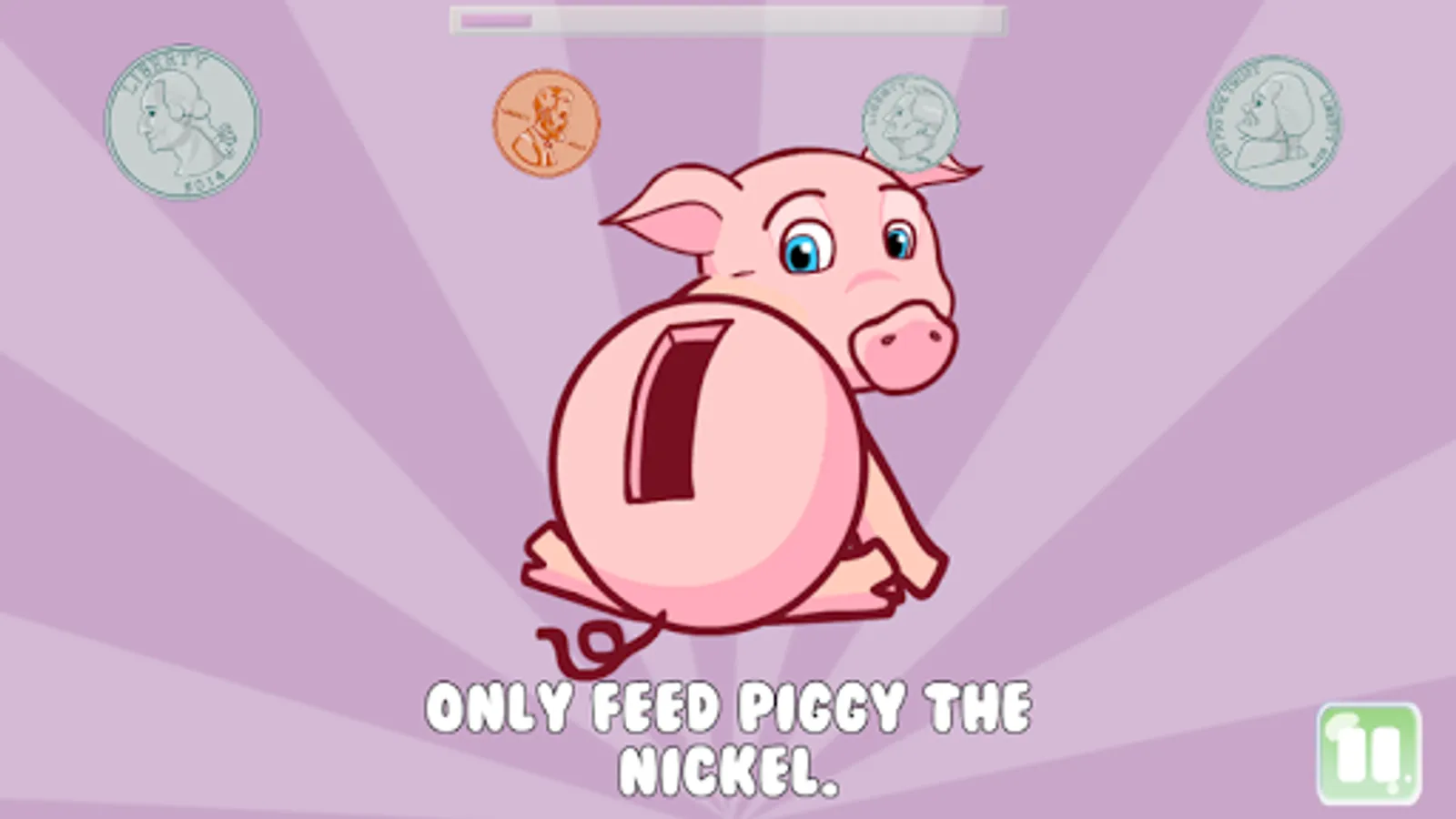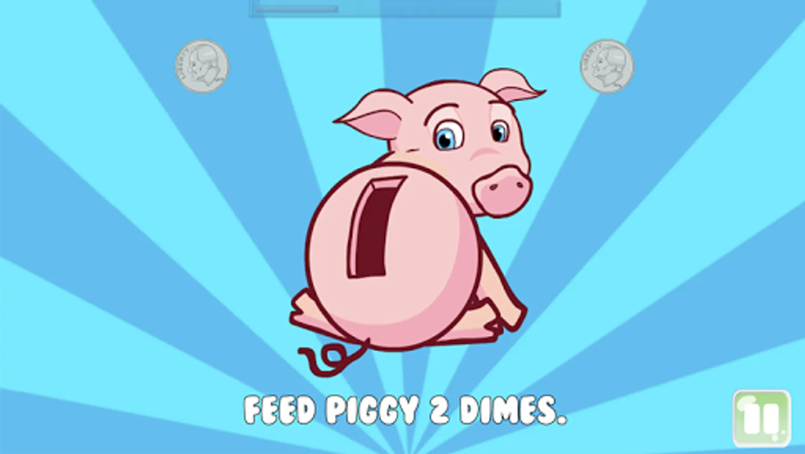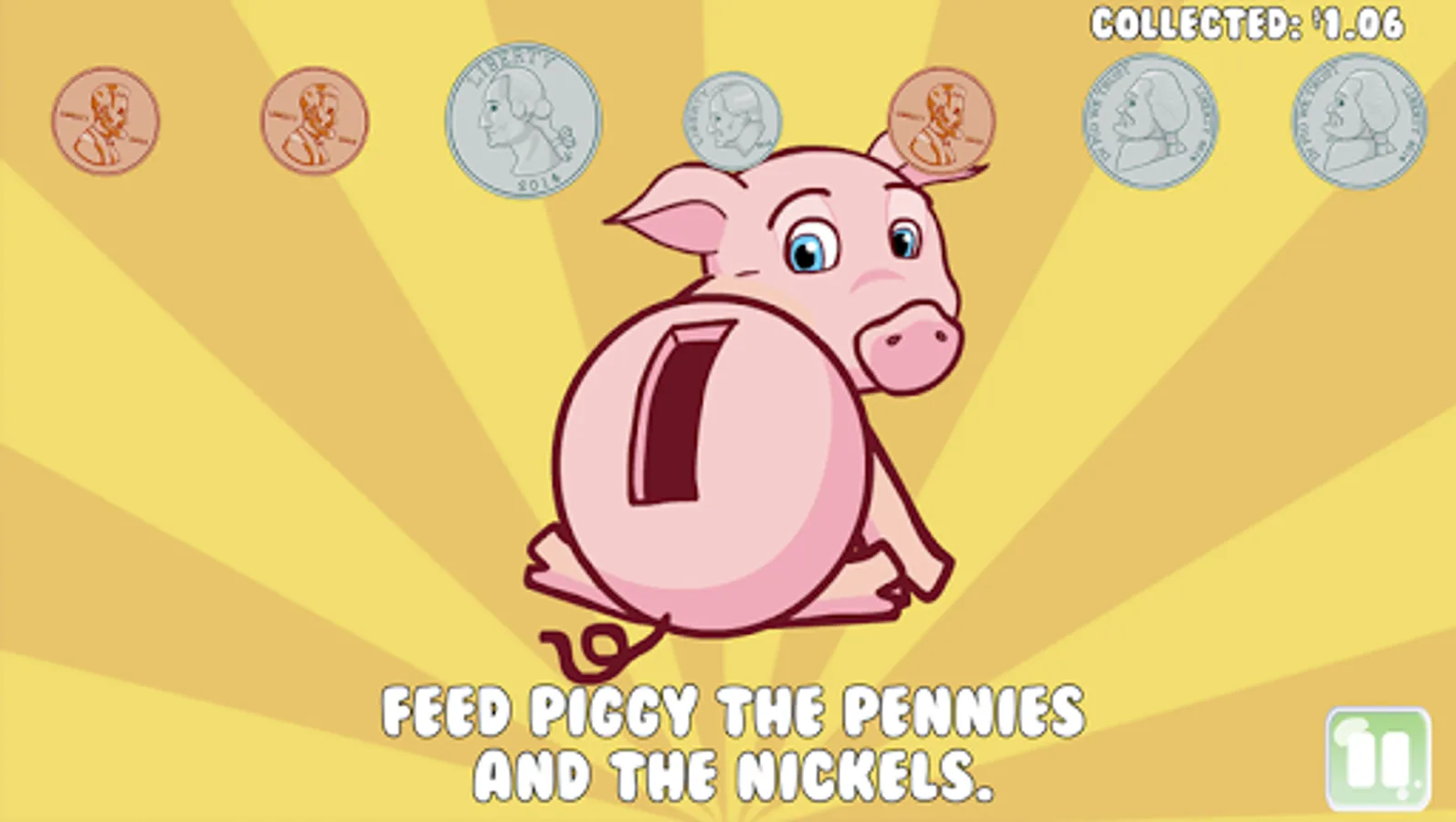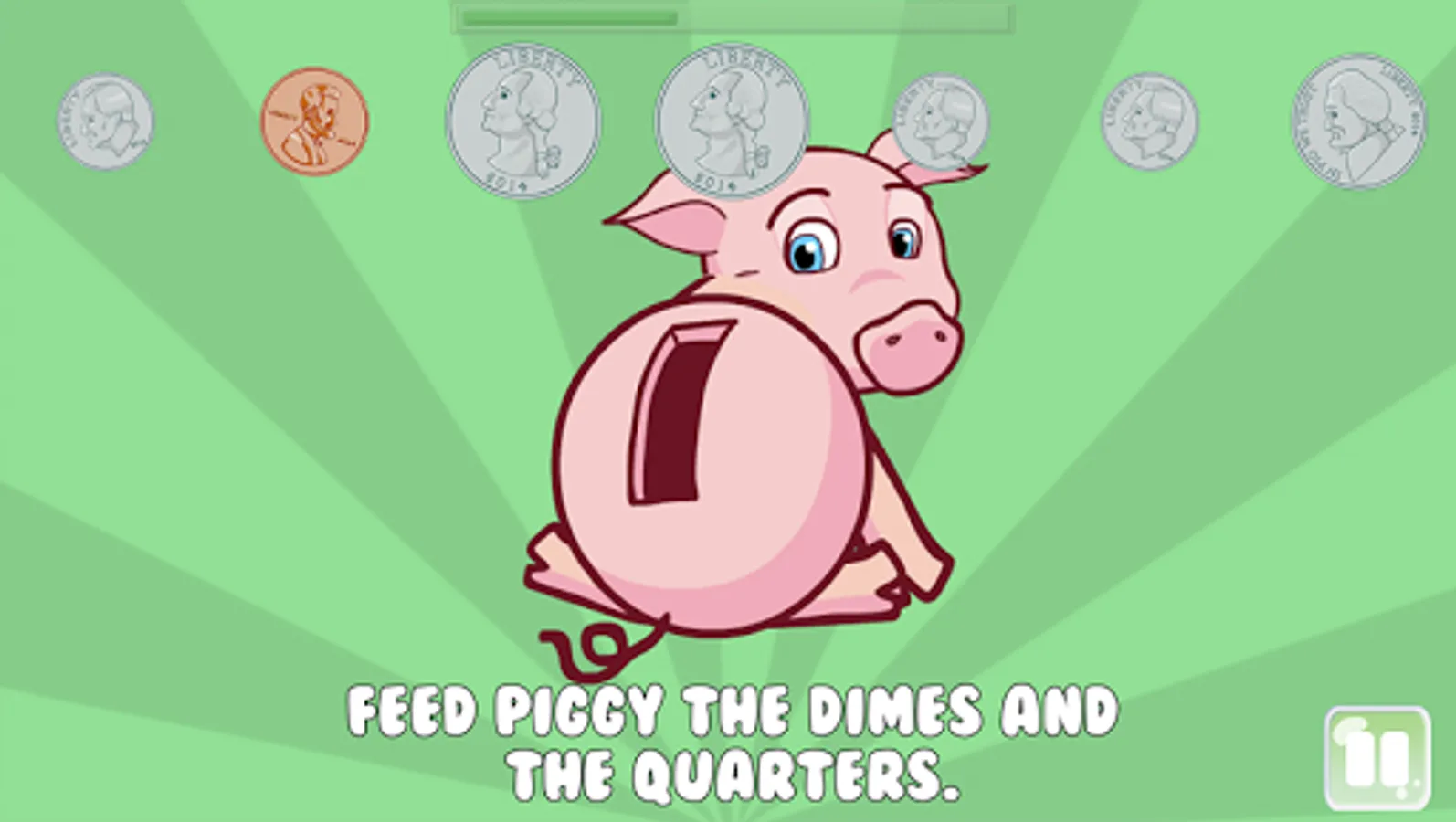 Saving with Piggy is a educational game that helps young children (age 2 to 5) learn about coins by feeding piggy (aka, putting coins in the piggy bank). The game features Piggy, a lovable animated piggy bank that needs help saving coins.