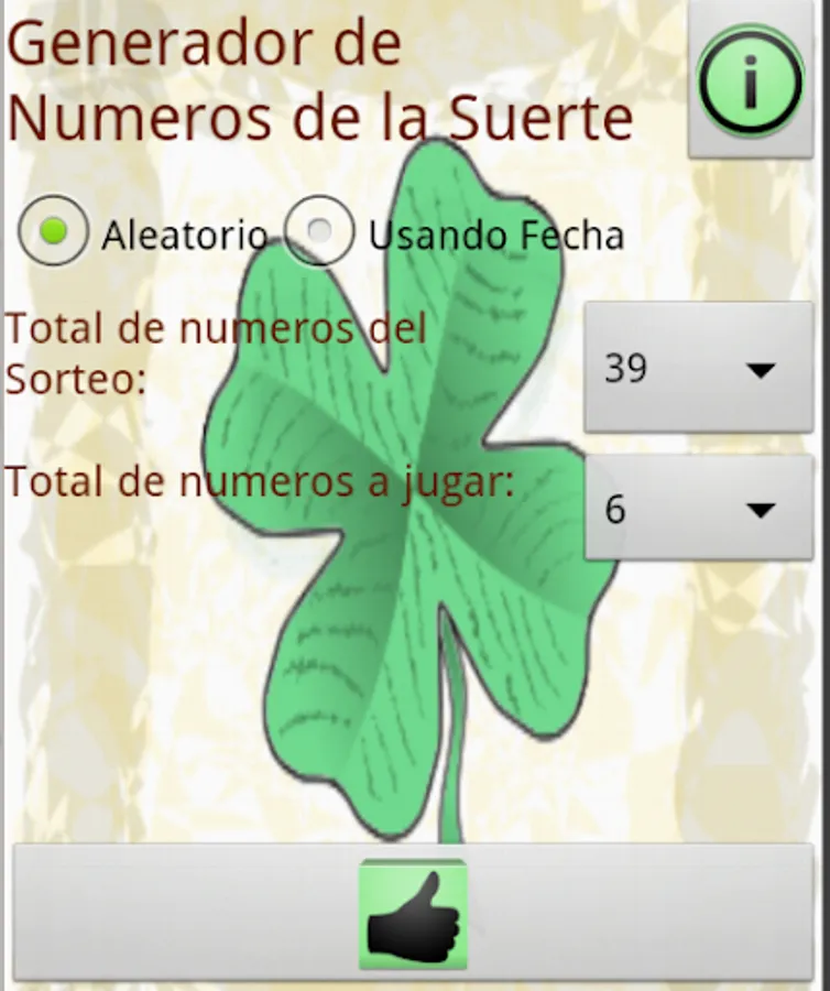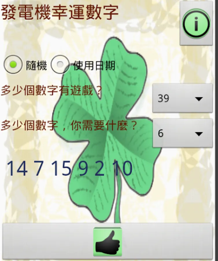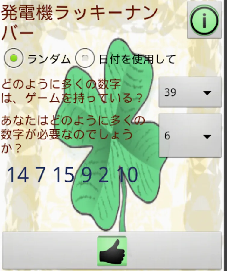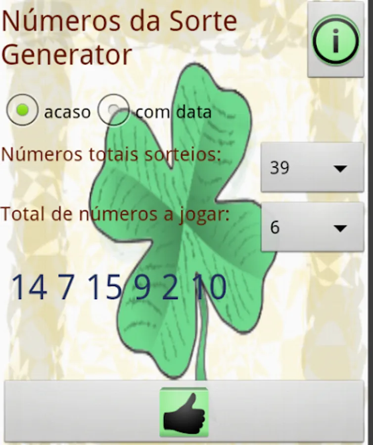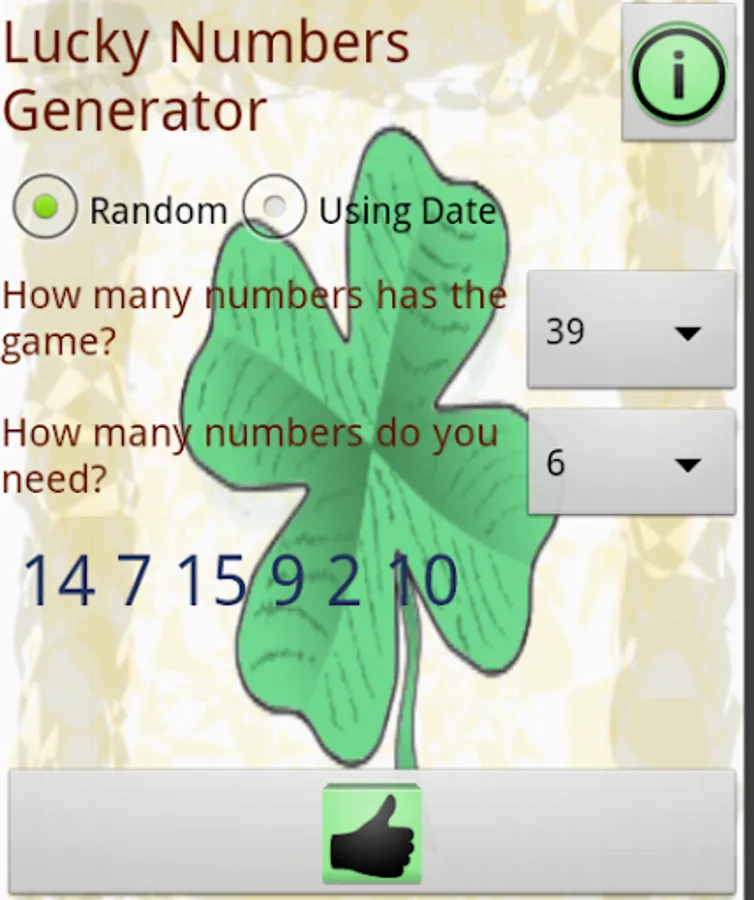 This is an application to help you choose your lucky numbers for any lottery in the world. You only have to set how many numbers you need, how many numbers are in the draw and ready.