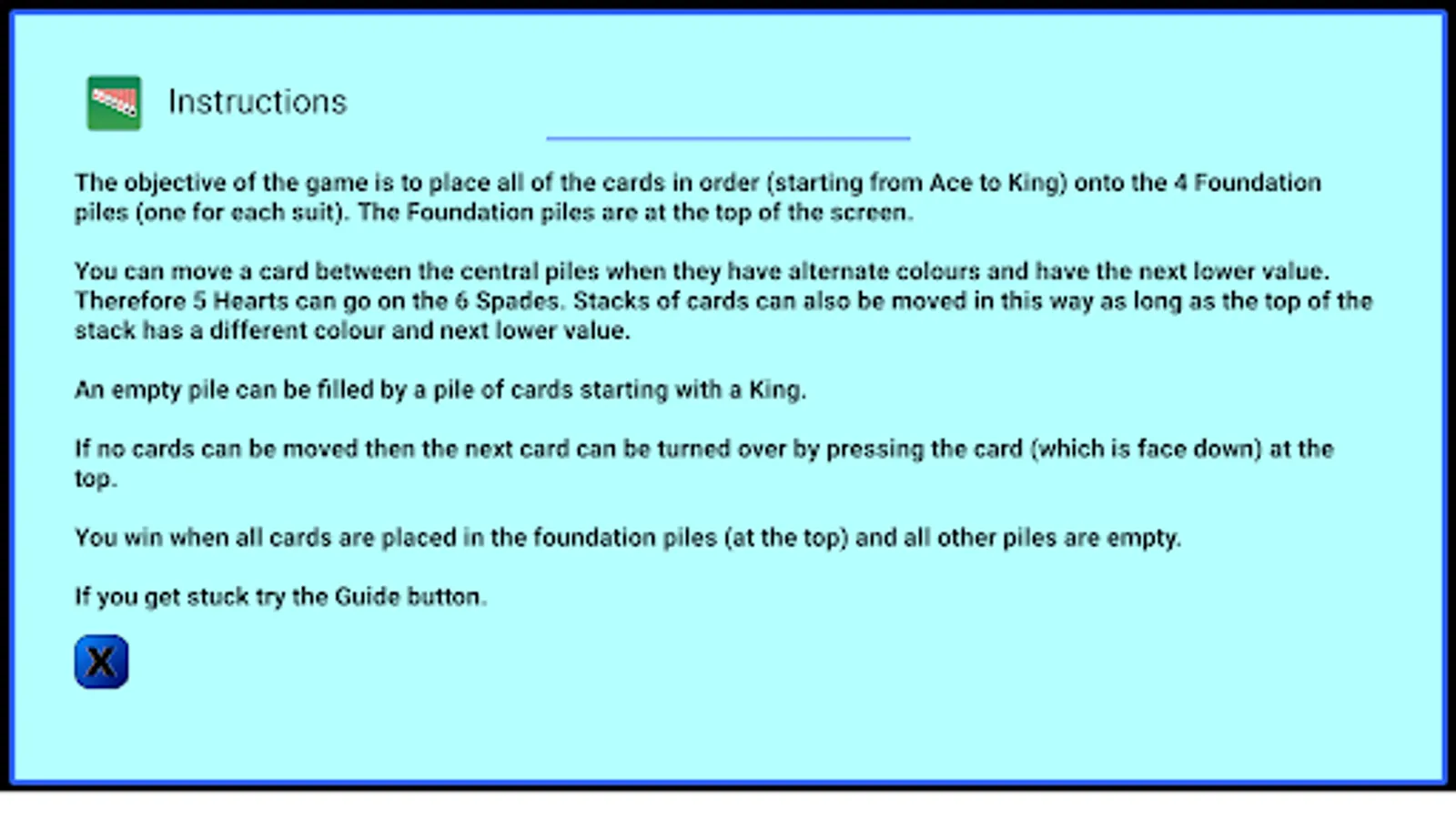 Classic Solitaire is also known as Klondike or Patience and is similar to Windows Solitaire.