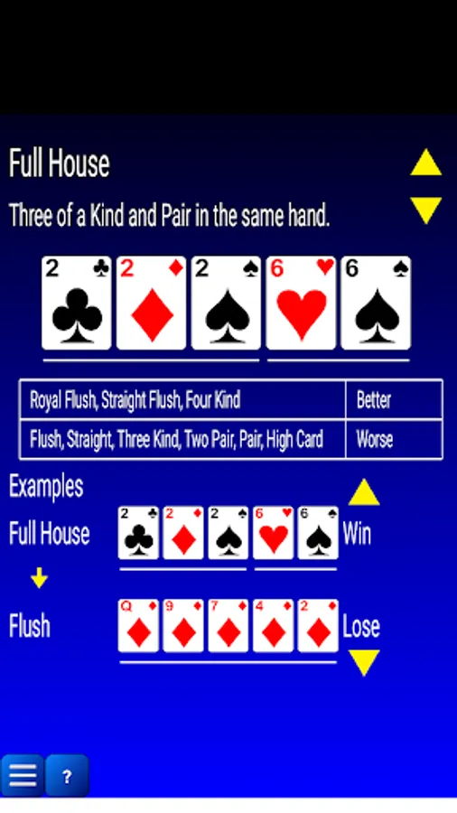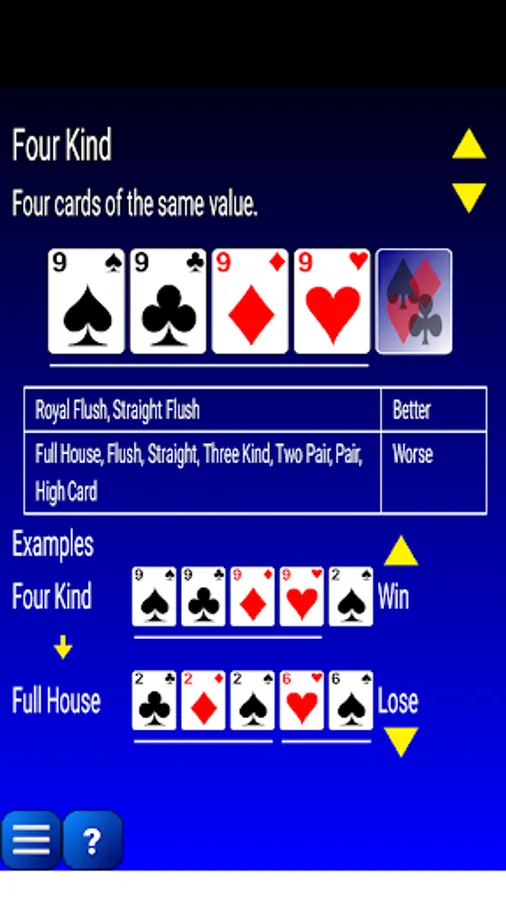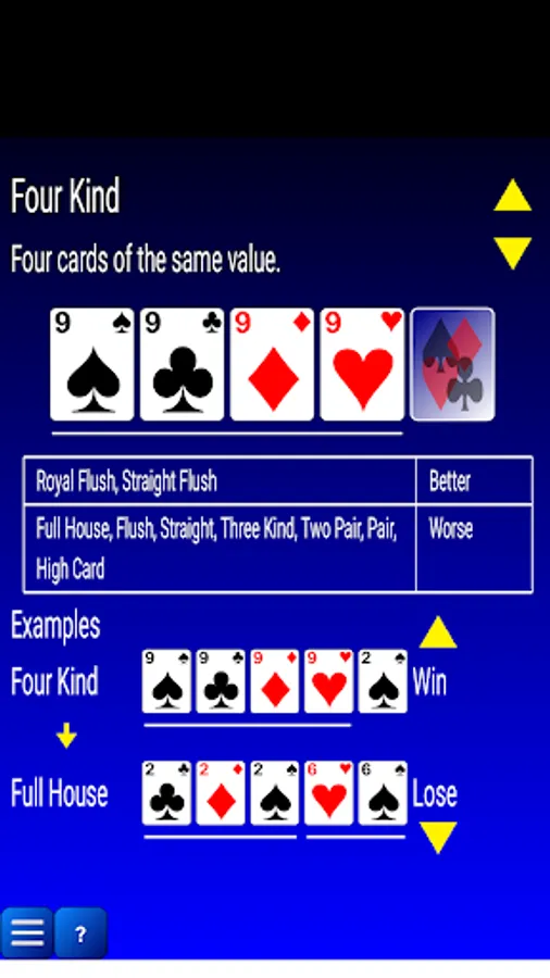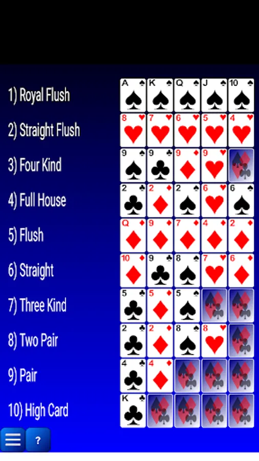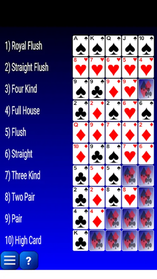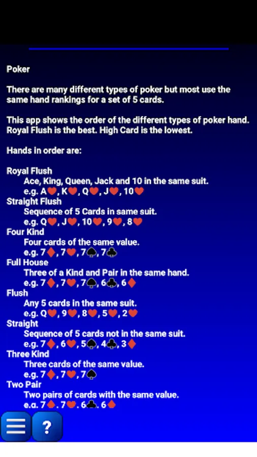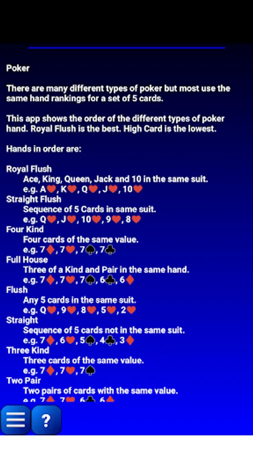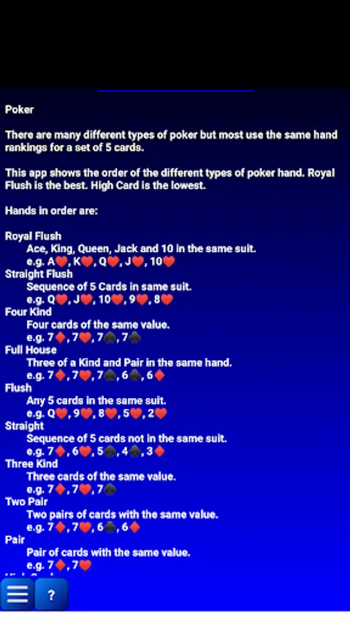 This app shows you which are the best types of hand to hold and which hand beats which. There are 10 different types of hand : Royal Flush, Straight Flush, Four of a Kind, Full House, Flush, Straight, Three of a Kind, Two Pair, Pair, High Card. The app explains these types and provides examples of each.