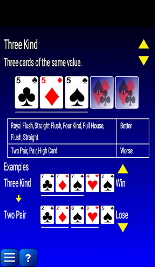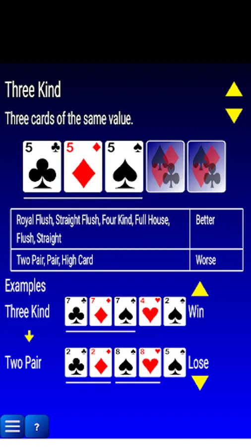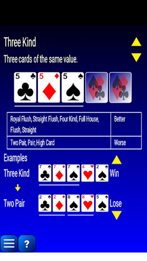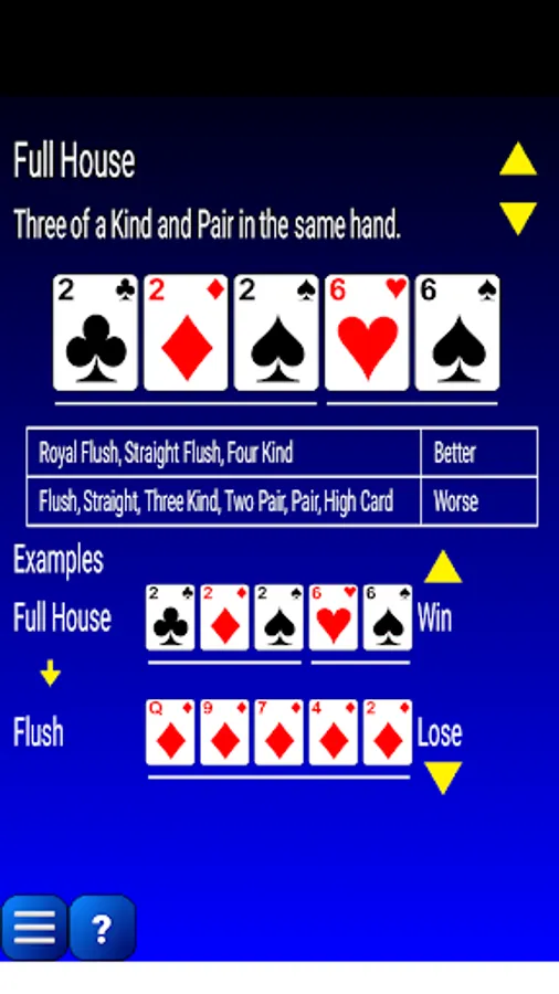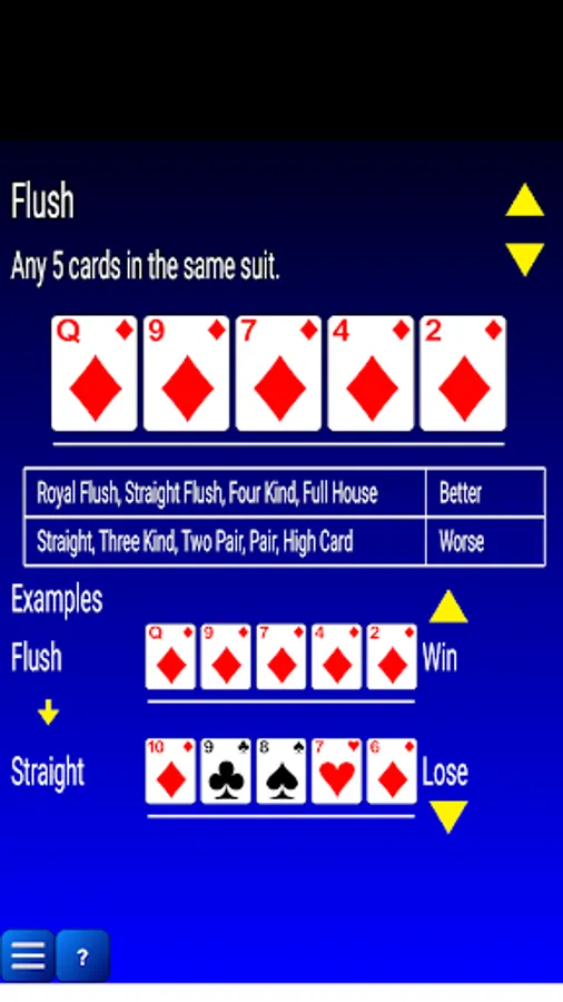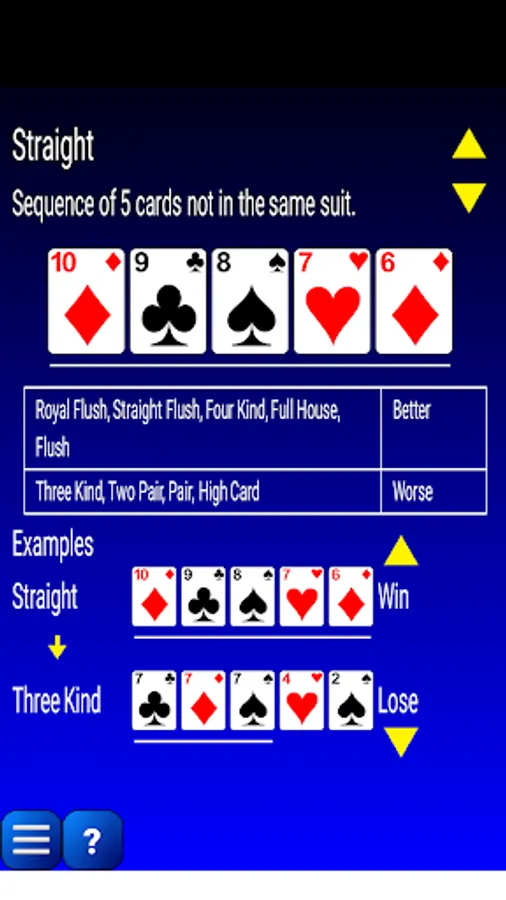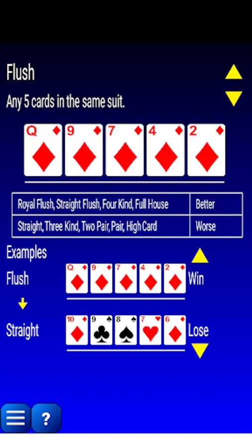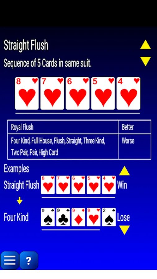 This app shows you which are the best types of hand to hold and which hand beats which. There are 10 different types of hand : Royal Flush, Straight Flush, Four of a Kind, Full House, Flush, Straight, Three of a Kind, Two Pair, Pair, High Card. The app explains these types and provides examples of each.
