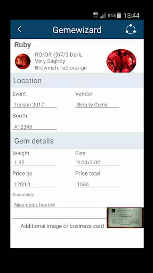 My Gemewizard enables users to quickly and accurately capture (or upload) a gem image, identify its exact color, and communicate that information, together with additional information such as the gem vendor and the event it was presented, to a third party via email, sms messages, WhatsApp, etc.