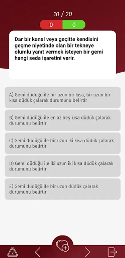 Our application content; There are exam questions for yacht captains, deck and machinery officers for yacht captains, deck-engineering for yacht captains, stcw and amateur sailors consisting of questions asked in 5 basic certification exams. There are multiple choice options in the application and the correct answer to the question appears in green according to the option you marked. Green if the answer you marked is correct; If it is wrong, the red you marked will appear in green, if the correct one is correct. In this way, you can instantly learn the correct answer to the question. You can also use our tests for some kind of study purpose.