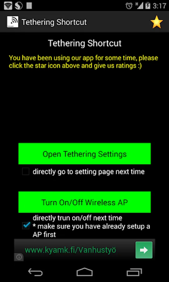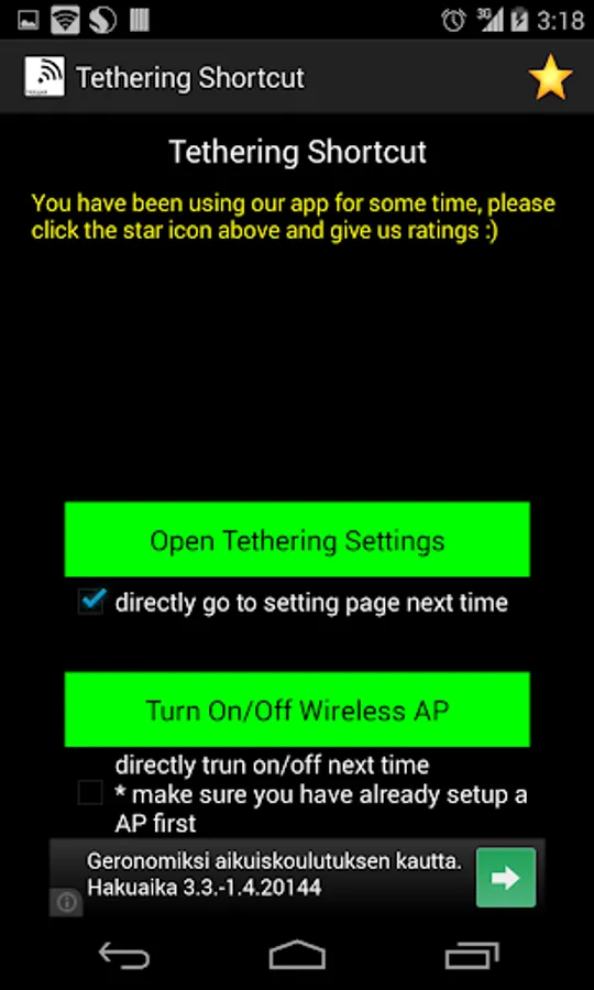 In current Android system, you need to navigate and at least click 5 times to reach Tethering & portable hotspot settings... Tethering Shortcut give you much simpler way to create your own WiFi spot on your phone, now it just need one click to start and stop your WiFi hotspot.