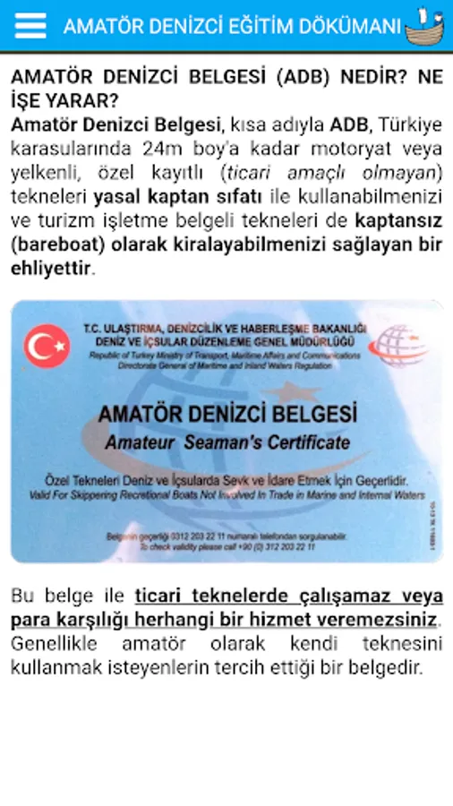 According to the Uygulama Implementation Instruction on Amateur Seaman Training and Exams yayımlan published on October.2018, Amateur Seaman's Certificate (ADB) and Short Distance Radio (KMT) trainings and exams started to be given after a short training and a simple exam at the port offices.