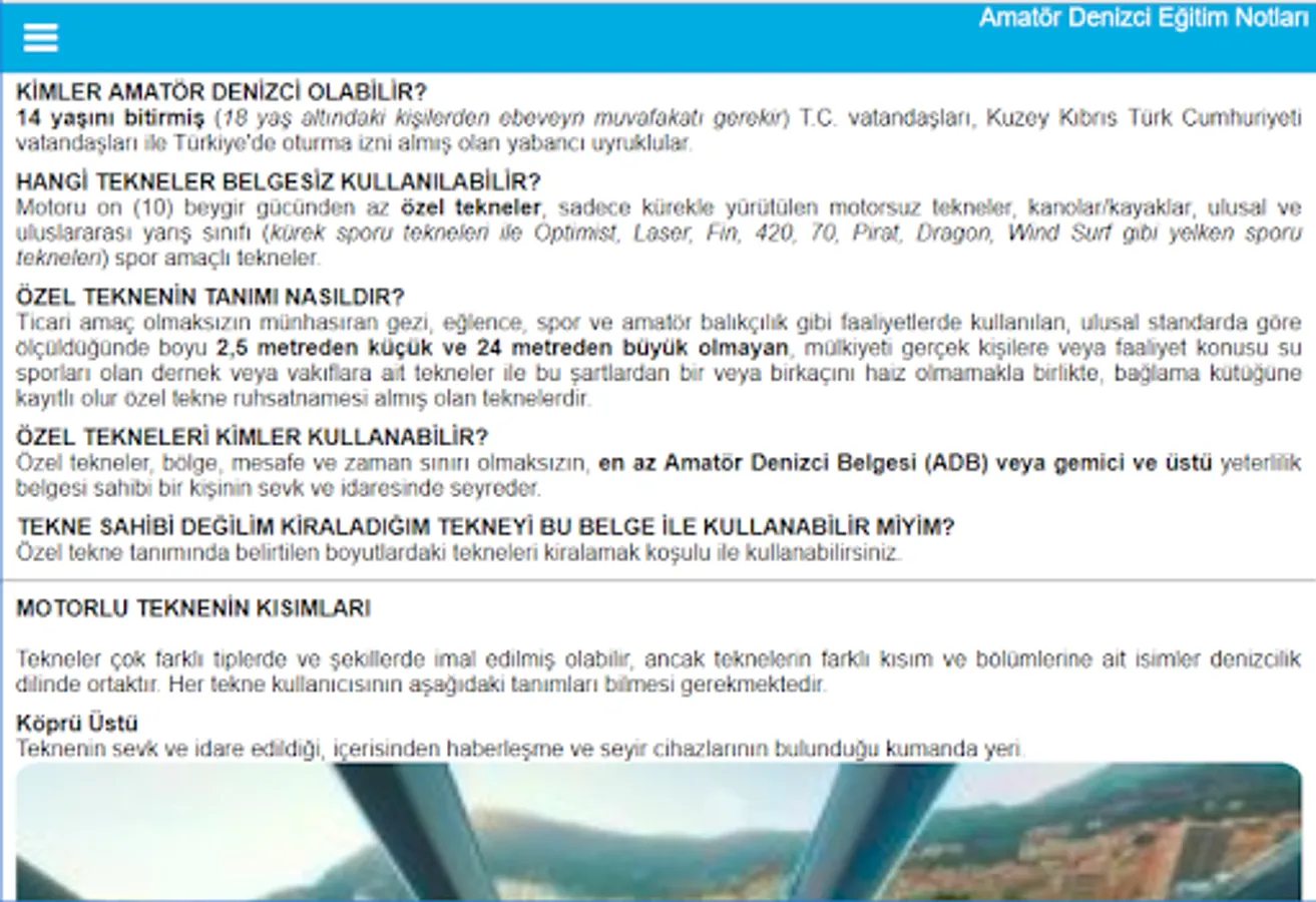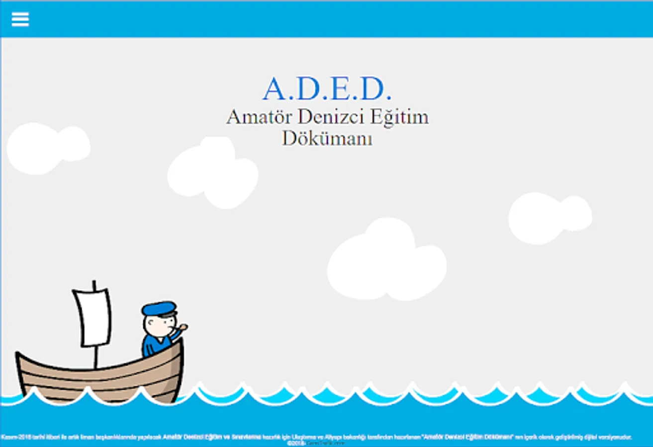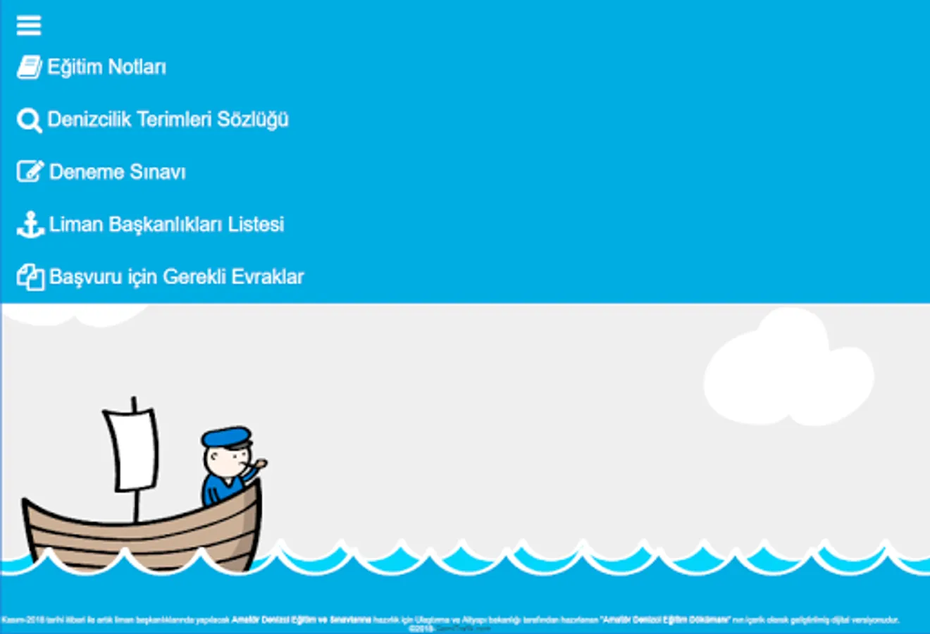 T. C. Prepared by the Ministry of Transport and Infrastructure for the preparation of "Amateur Seaman Training and Exams" for the purpose of liman 1 million amateur seafarers ”by the Ministry of Transport and Infrastructure until the 100th anniversary of the Republic of Turkey in November-2018. Is a digital version enriched in content.